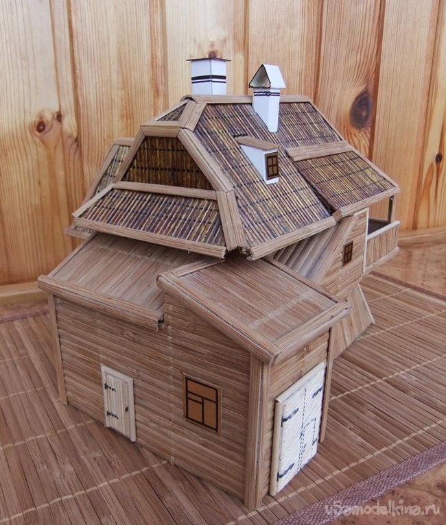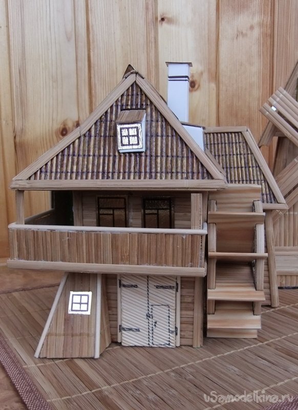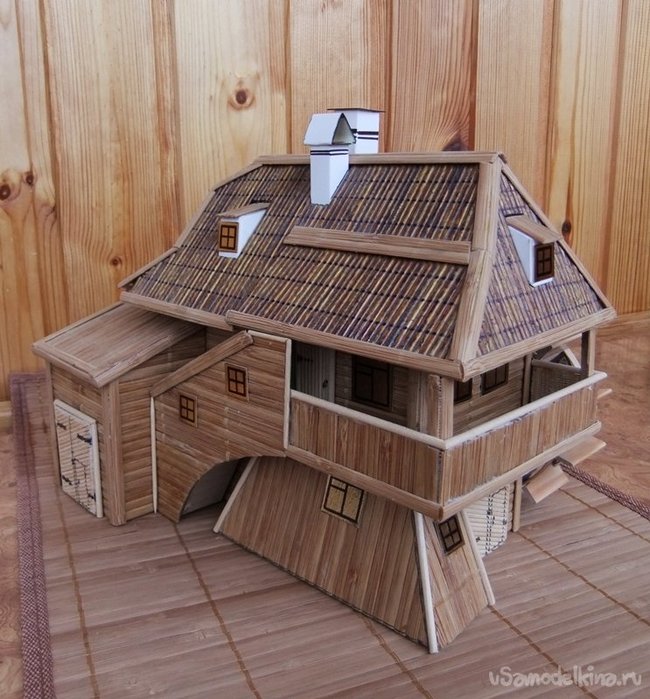 Прорезаются отверстия для слуховых окон. Покрытием, в роли черепицы, здесь будут служить наклеенные бамбуковые палочки. Потом на них нанести линии укладки фломастером и покрыть лаком
