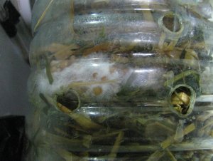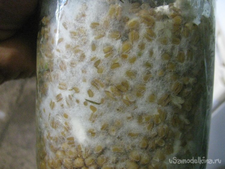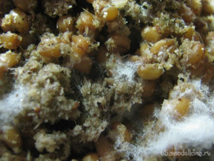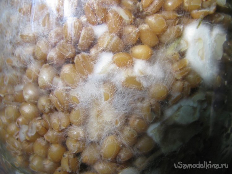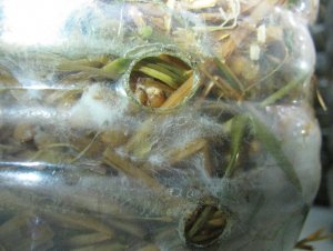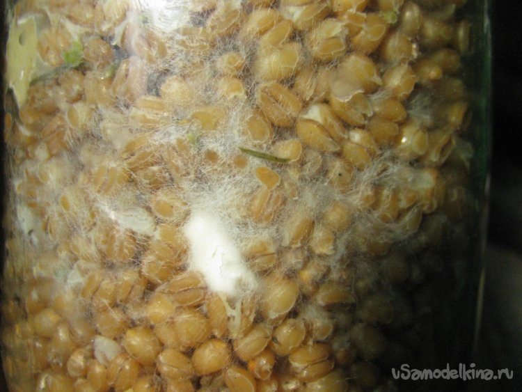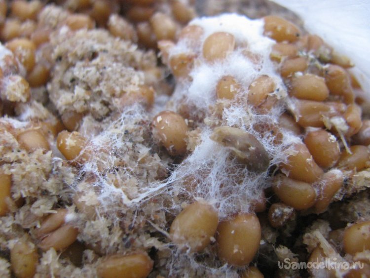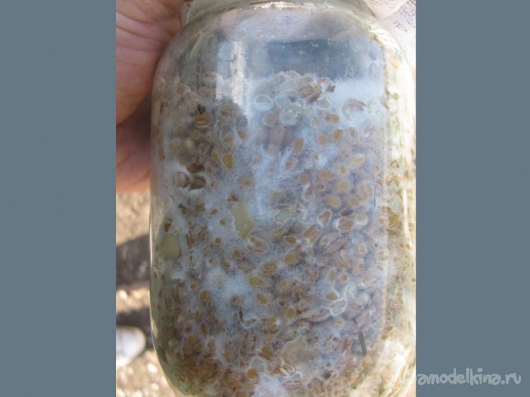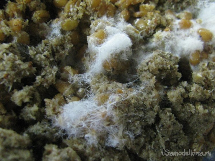 В одну банку я засыпал и мусор, оставшийся от грибов. Там развития мицелия не произошло вообще! Вероятно, попало слишком много грязи, на данный момент там растет какая-то мохнатая плесень.