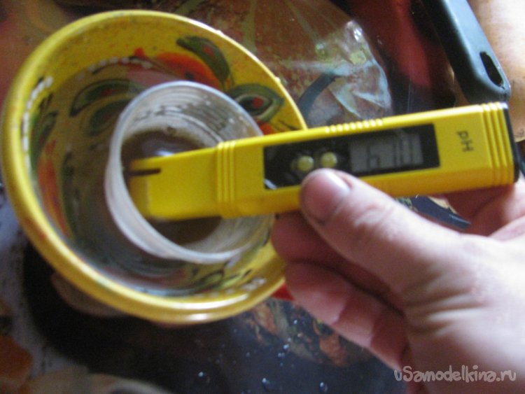 Я аккуратно снял эту плесень вилкой, а чистый мицелий с зерном высыпал. Понадобится обновление субстрата, так как в старом мицелию слишком тяжело дышать, там много слизи от зерна и не проходит воздух. Сварил немного опилок из тополя, проверил pH, он оказался в районе 6 единиц, это маловато и может разрастаться плесень. Добавил немного извести в воду, перемешал и получил pH в 9.1 единиц вместо 8 рекомендуемых, ну да ладно.