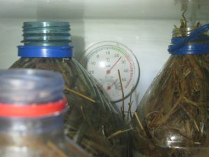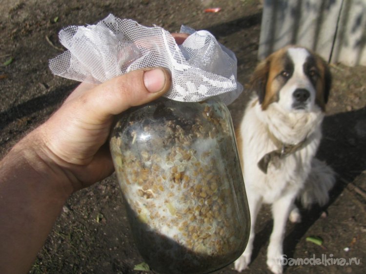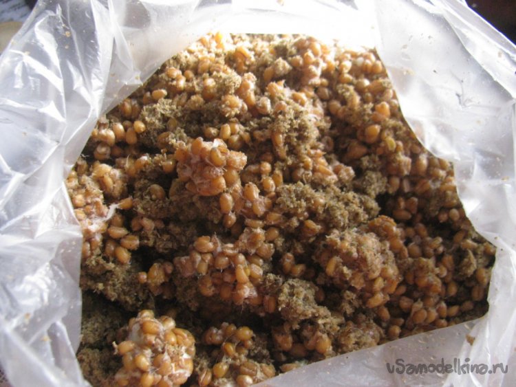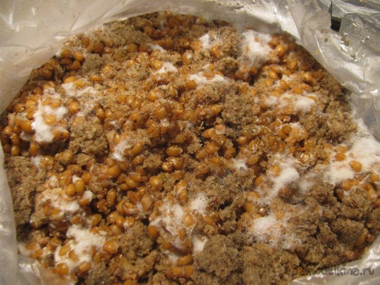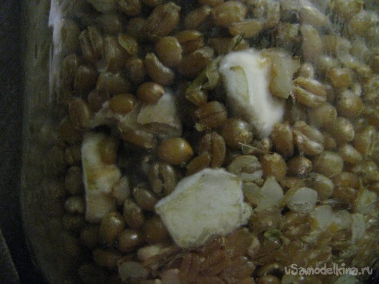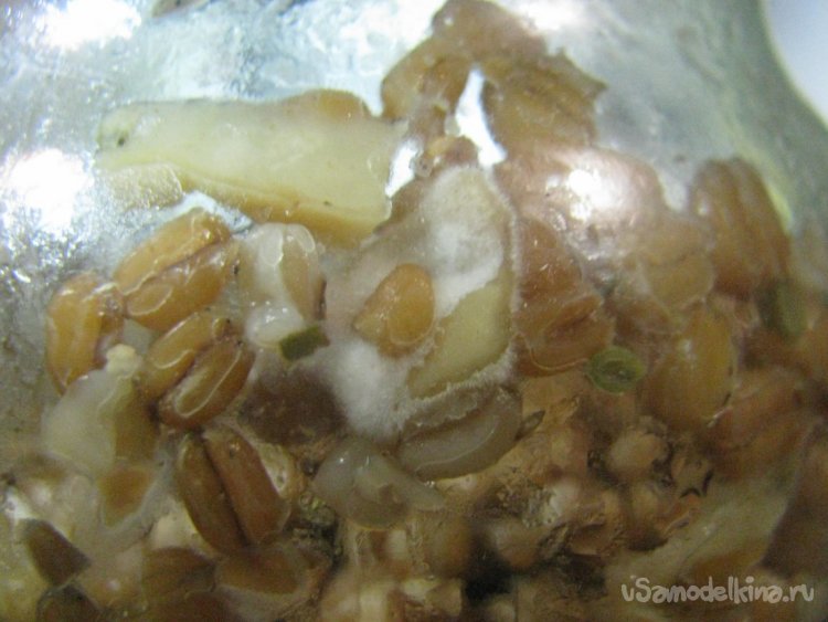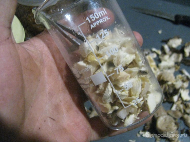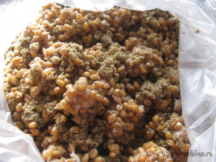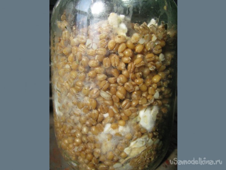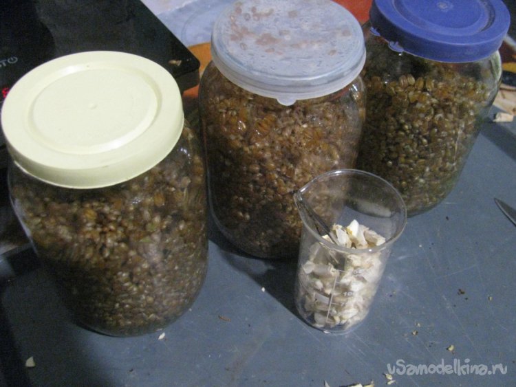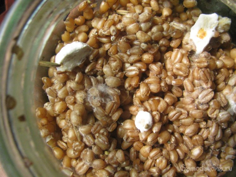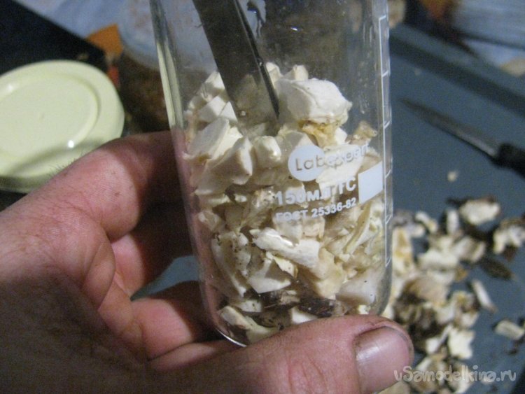 Хорошо помыл руки и вырезал внутренние части ножки гриба. Кусочки грибов были засыпаны в банки, зерно было еще теплое, около 30С, хорошо потряс, чтобы все перемешалось, плотно закрыл и оставил возле печки.