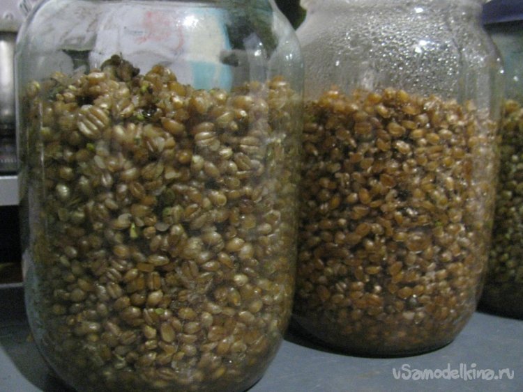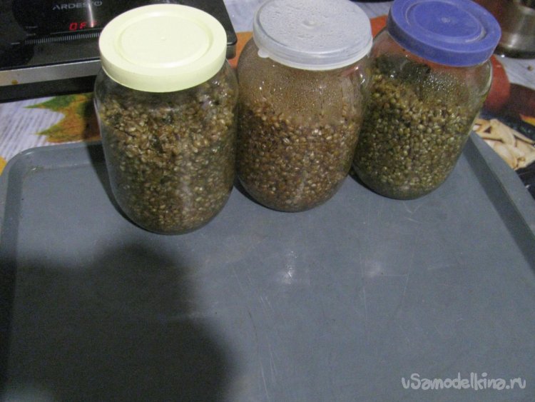 Воду я с зерна не сливал, вернее не было ее там, зерно всю впитало, я лишь немного подливал по надобности. Сразу горячее вареное зерно разложил по банкам, которые предварительно стерилизовал. Ну и в завершении накрыл сваренными в воде крышками. Благодаря такому подходу мы убиваем основное количество вредных для нас бактерий и грибков. Оставляем все это дело остывать.
