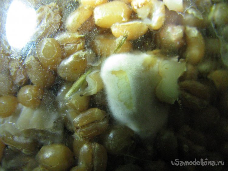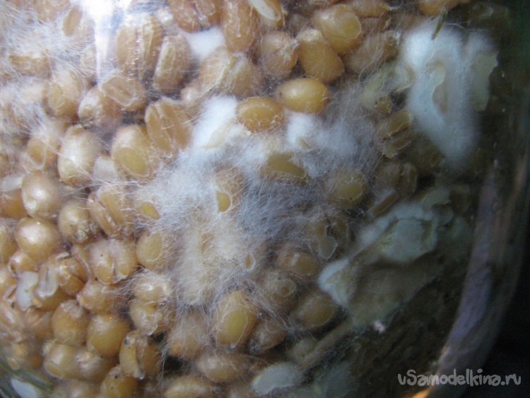 На третий и на четвертый день мицелий не развивался, тут я заподозрил неладное, видимо, ему не хватало воздуха. Вечером на четвертый день я открыл банки и накрыл тряпками, а утром уже был удивлен! Внутри по зерну поползла отличная паутина мицелия!