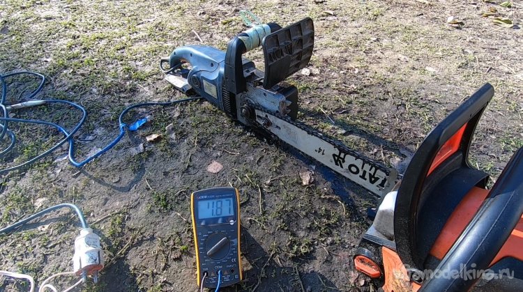 Бензопила у меня из слабеньких, всего 38 куб. см и 1700 Вт, так что даже 5А тока дается мотору с трудом.