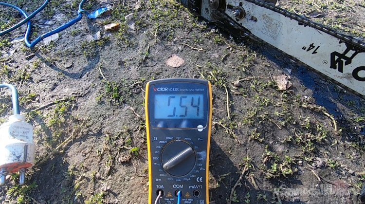 На холостых бензопила тянет электропилу без проблем, напряжение при этом достигает 20В. Конечно, тут крутится все через ненужный редуктор в электропиле, зато собирается легко. Если разделить обмотки в пиле и на одну подавать «возбуждающее» напряжение, вал мотора можно напрямую подключить к валу бензопилы, минуя даже сцепление бензопилы.