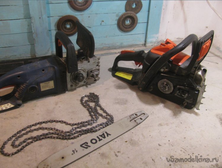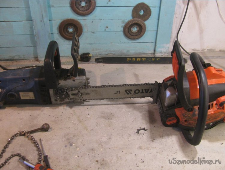 Всем привет, ради эксперимента решил скрестить бензопилу с электропилой, чтобы посмотреть, сколько может выдать такой генератор. Шаг цепи на бензопиле и электропиле у меня одинаковый, так что сборка занимает буквально 15-20 минут при наличии болгарки и дрели.
