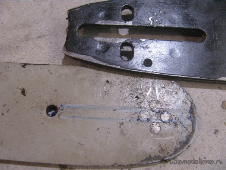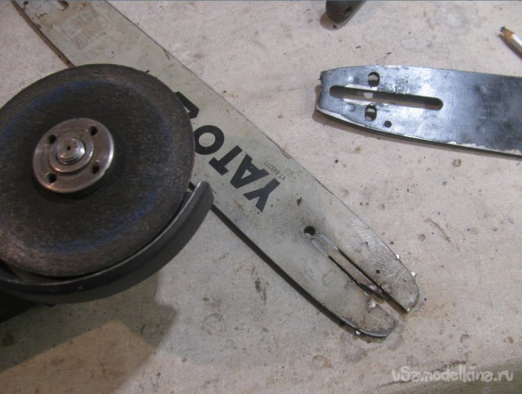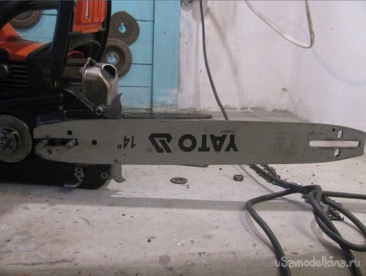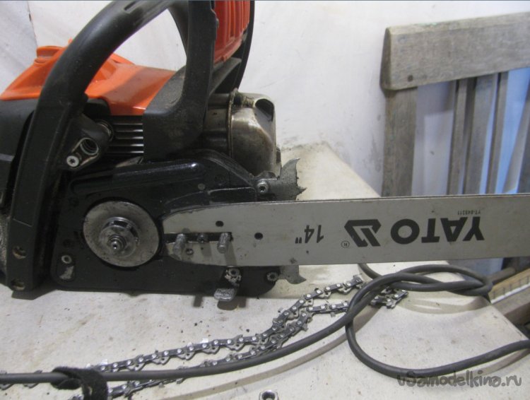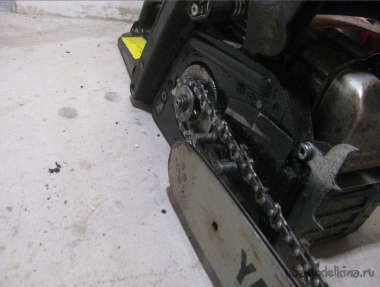 Все готово, собираем самоделку, натягиваем цепь. Если отверстия для смазки не сделано, можно смазать вручную, хотя бы солидолом. Дерево цепь резать не будет, так что смазка долго сможет находиться на шине.