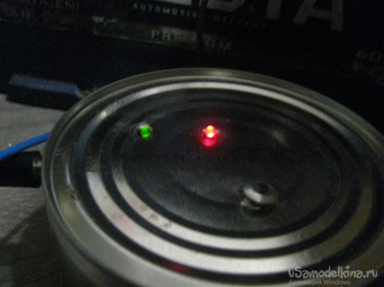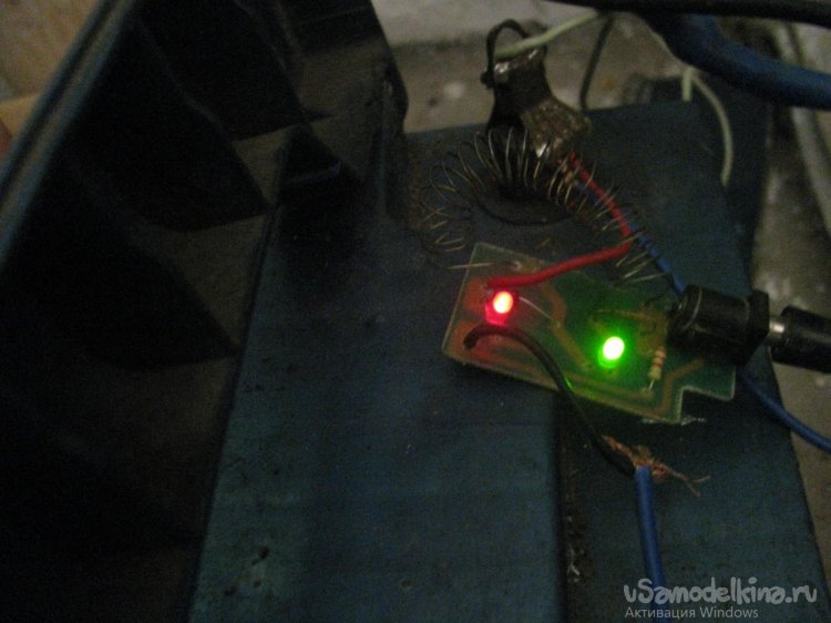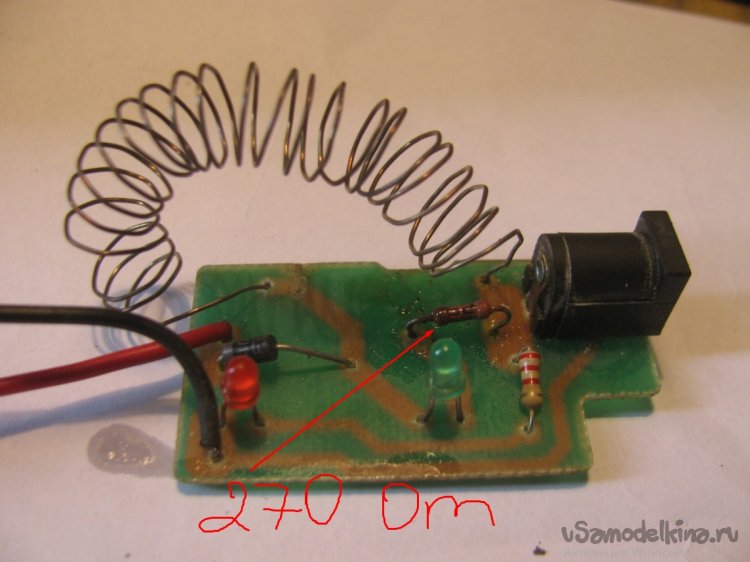 А зеленый светик через резистор на 100 Ом подключен параллельно «силовому» резистору. То есть яркость его свечения определяется тем,  какой ток проходит через «силовой» резистор и какое там падение напряжения. Поскольку под новые характеристики светик горел слишком ярко, я впаял другое сопротивление на 270 Ом, но можно и больше, на 300-400 Ом.