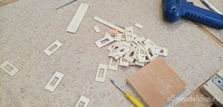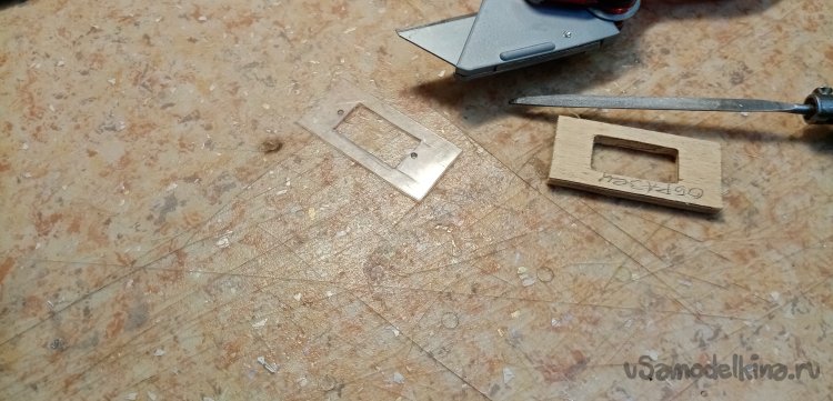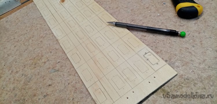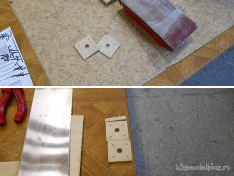 Для установки сервоприводов применяю фанерные рамки. По специально изготовленному пластиковому шаблону размечаю заготовки на фруктовой фанере. Выпиливаю лобзиком. Для удобства выпиливания внутренних объемов в рамке, просверлил отверстия во всех четырех углах. Так удобнее поворачивать пилку. Заранее изготовил достаточно большое количество про запас.