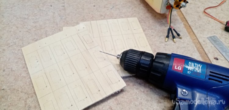 Сразу намечаю при помощи шила отверстия под тяги из сварочной проволоки диаметром в 1.2 мм.