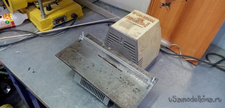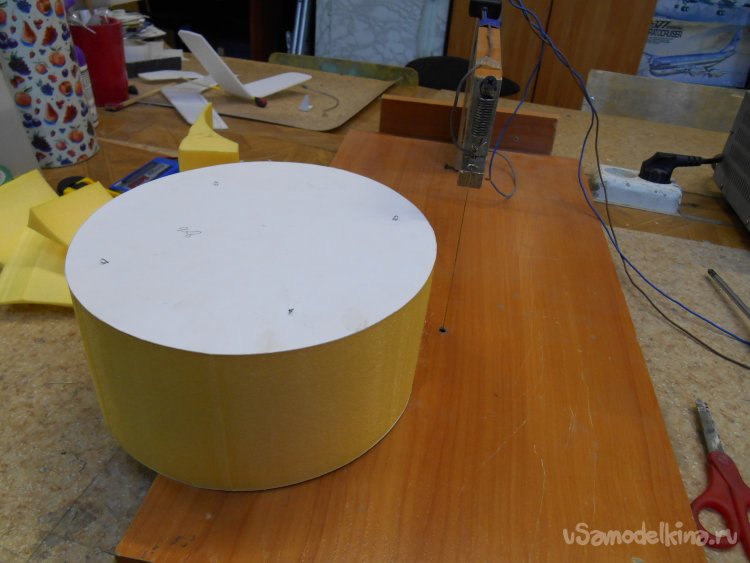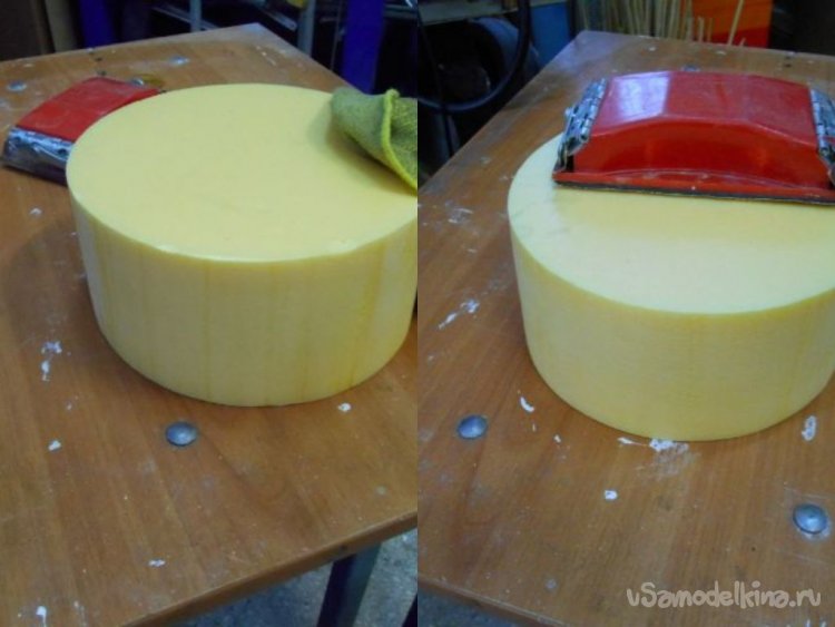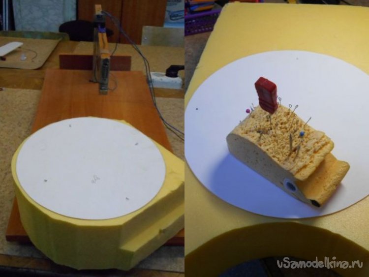Режу заготовку раскаленной струной при помощи самодельной пенорезки. После вырезания круглого цилиндрического шаблона обрабатываю поверхность утюжков со шкуркой нужного зерна.