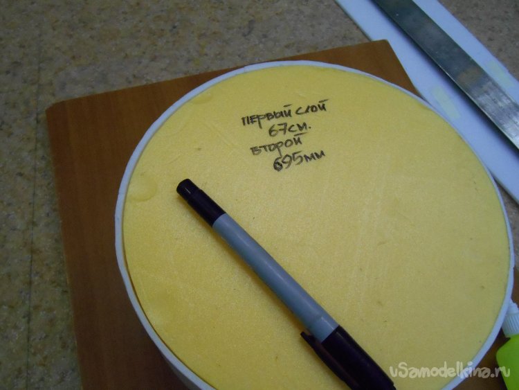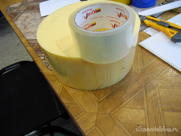 Затем на круглой заготовке, прямо по месту, отмеряю нужную длину полоски потолочки. У меня получается первый слой в 67 см. Записал размер прямо на шаблоне для памяти. Отрезал нужный размер, тщательно натягивая, склеил встык первый слой потолочной плитки. Закрепив при помощи малярного скотча, концы. При наклеивании второго слоя скотч можно не убирать. Прочнее будет. Нужно только следить, чтобы стуки наклеенных слоев не совпадали.
