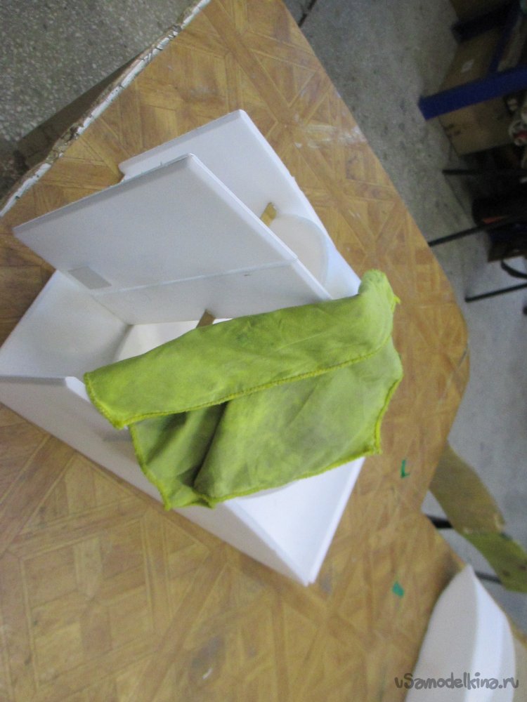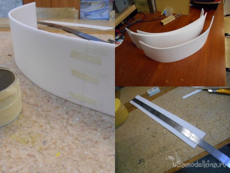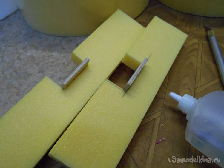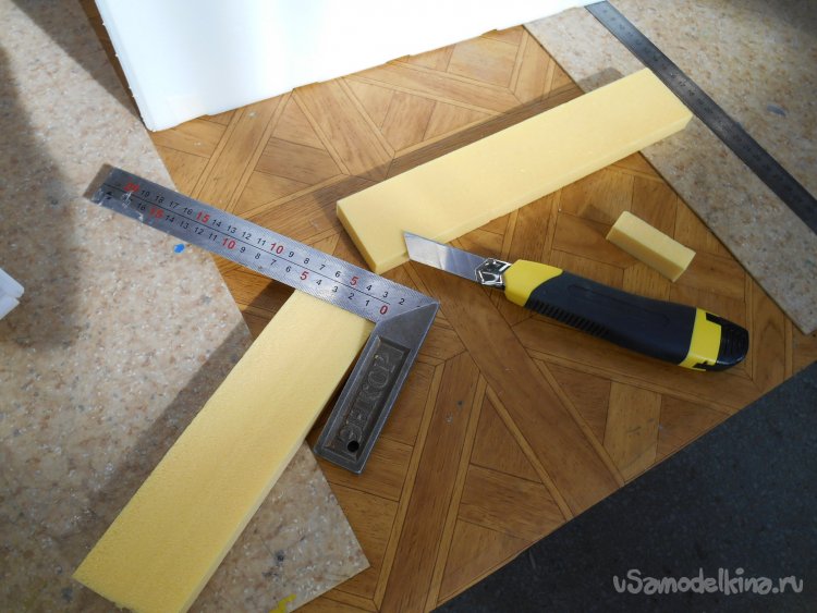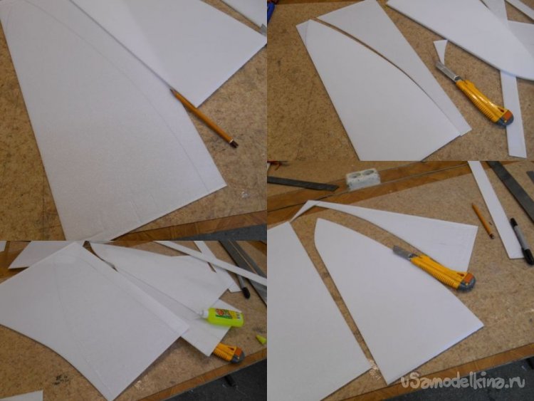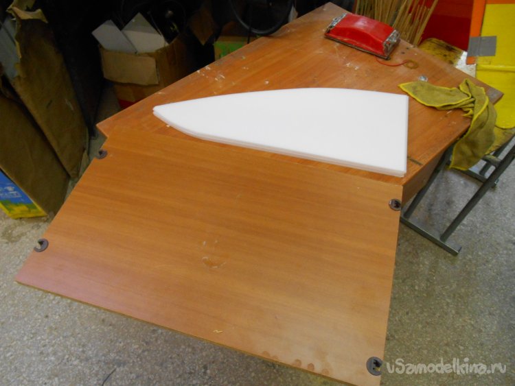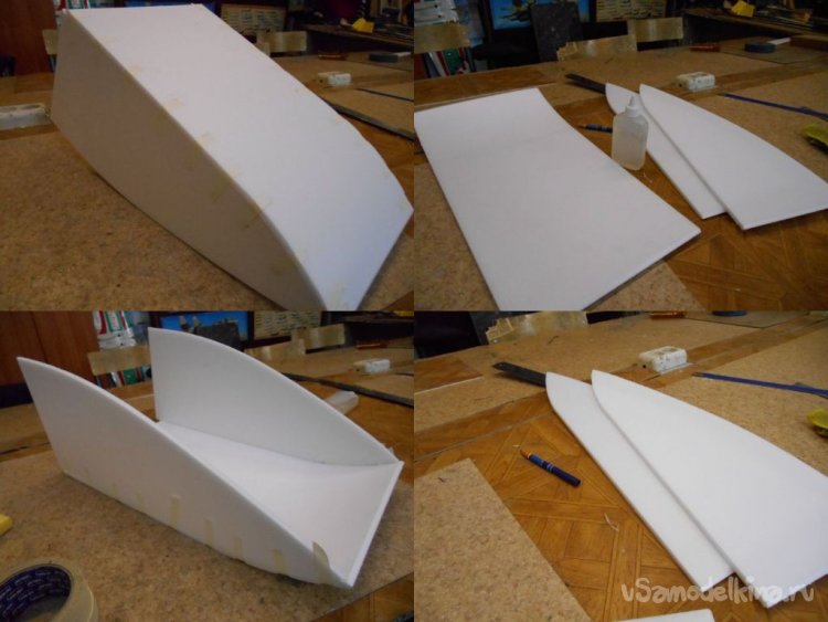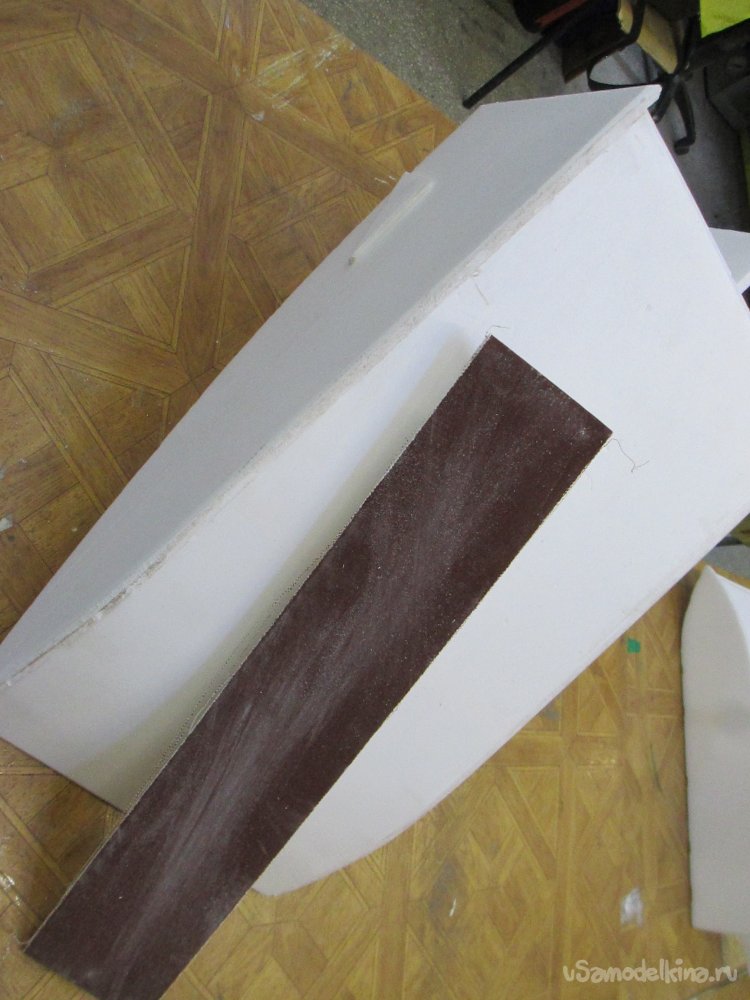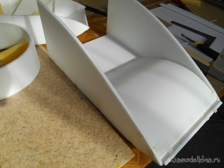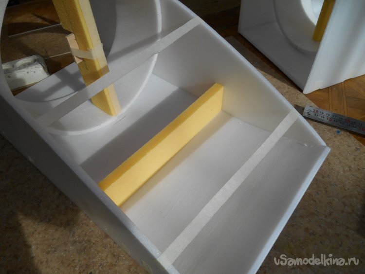 Детали подсохли нужно собирать конструкцию. Из утеплителя толщиной в 20 мм вырезал шпангоут усиления корпуса. Длиной точно на расстояние между стенками.