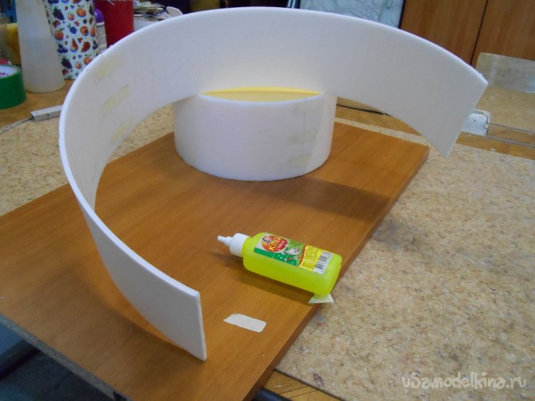 Из потолочной плитки вырезаю полосы шириной в 50 мм и толщиной в 4 мм. Для лучшего прилегания к круглой заготовке при приклеивании немного сгибаю полосы. Процедура происходит таким образом. Проталкиваю пенопласт о край стола. ( Желательно чтобы он был гладкий и закругленный немного) слегка нажимая на полосу руками. После такой процедуры он становиться более пластичным и не пружинит при склеивании. Понятно, что размер плитки всего в 500 мм не позволяет полностью оклеить по периметру такой большой кружок. Поэтому приходится склеивать полоски в торец клеем титан. Закрепляю их при помощи малярного скотча.