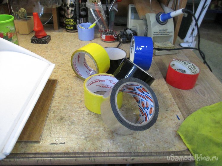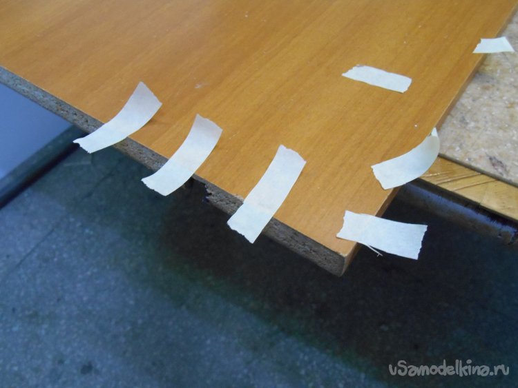 Для более удобного пользования малярным скотчем отрываю несколько полосок и приклеиваю слегка к столу.