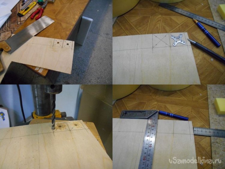 Мотораму выпиливаю из прочной 4 мм шлифованной фанеры. Сразу размечаю положение двигателя, используя для этого мотораму его крепления. Размечаю положение отверстий, шилом кенрю и просверливаю сразу под шурупы. Поскольку проделать эту операцию на собранных аэросанях практически невозможно. Как всегда изготовит парочку моторам в запас, может, пригодятся.