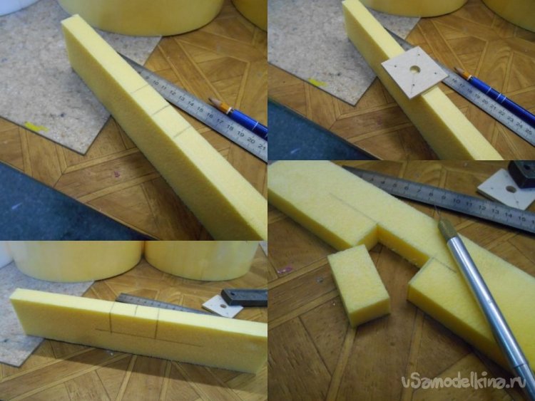 Из утеплителя толщиной в 20 мм вырезаю столбик для установки моторамы. Фанерную часть накладываю в нужное место, размечаю её положение, вырезаю установочное углубление.
