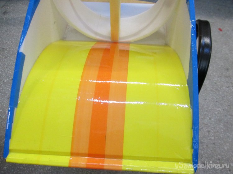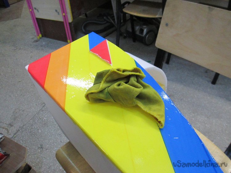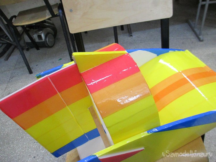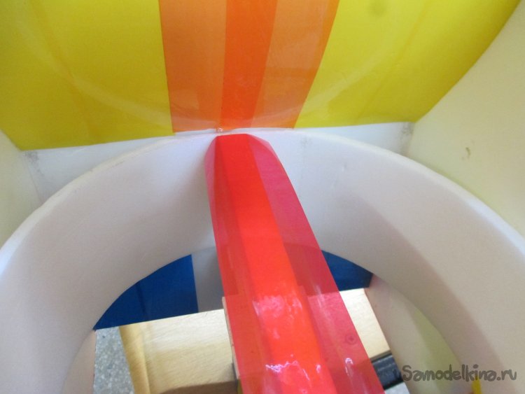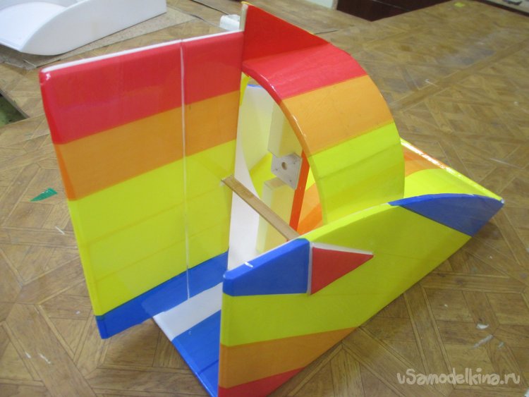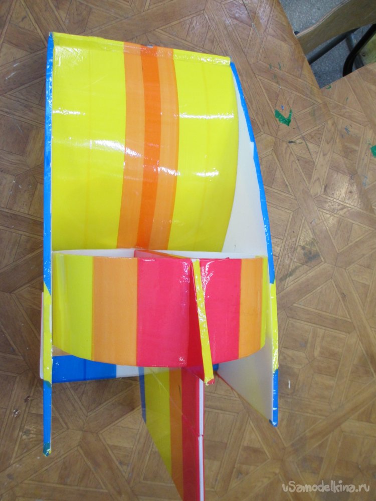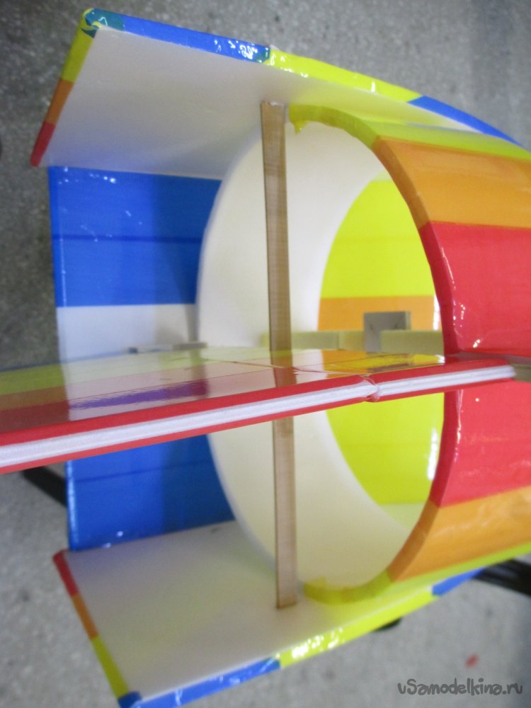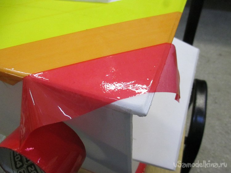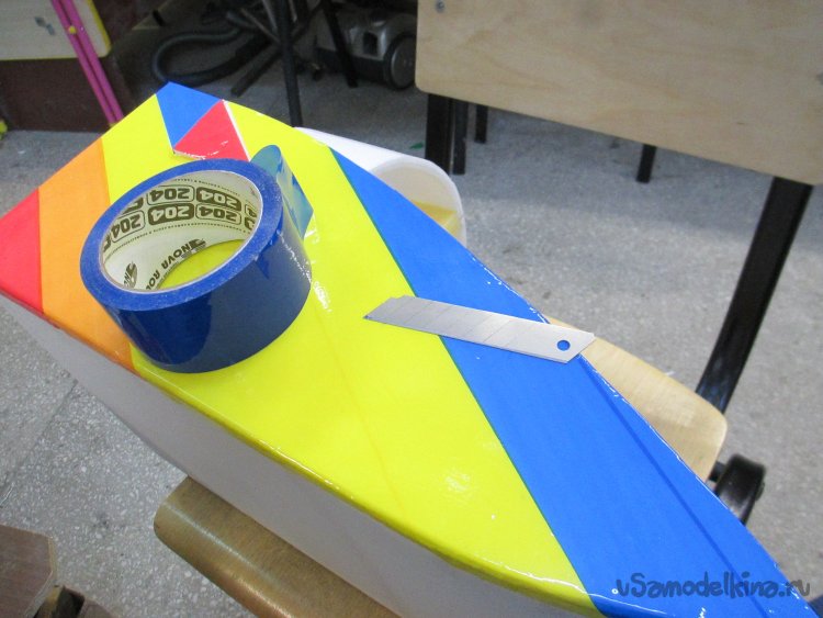 После этой процедуры приклеиваю на место защитное кольца и руль направления. Через борта, защитное кольцо и мотораму протыкаю рейку сечением 3х5 мм и приклеиваю её ко всем элементам. Это серьезное усиление. По бортам корпуса закрываю торцы рейки при помощи треугольных накладок. Протираю мокрой тряпочкой весь корпус от пыли. Буду декорировать глиссер цветным скотчем.