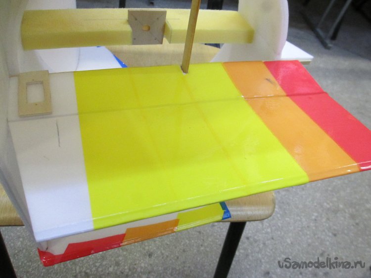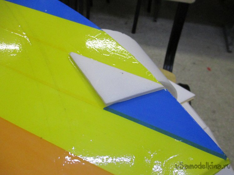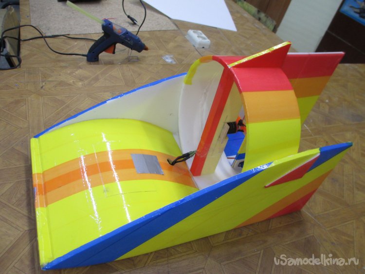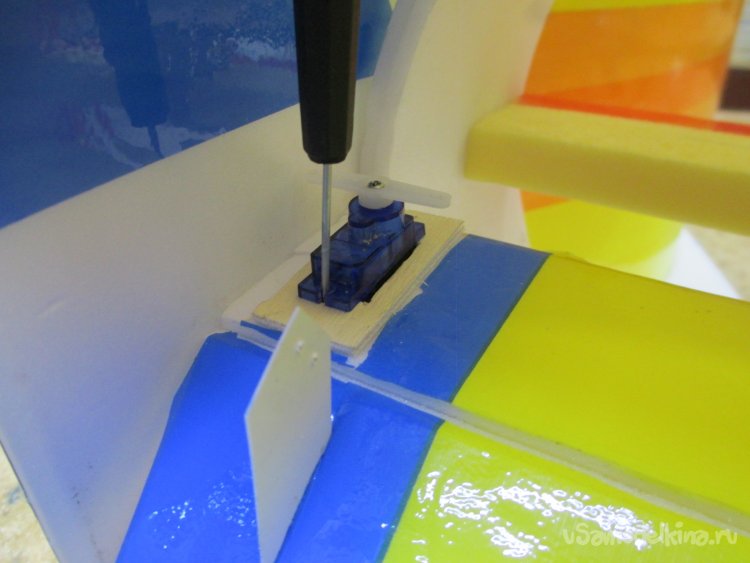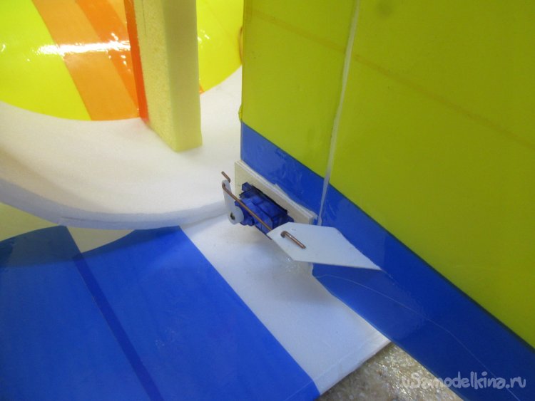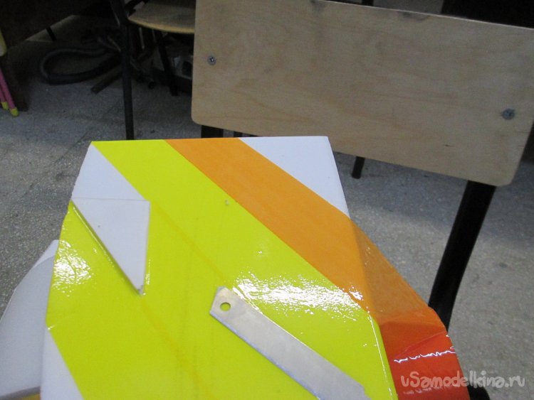 После окончательного позиционирования кабанчика на руле направления приклеиваю его при помощи термопистолета.