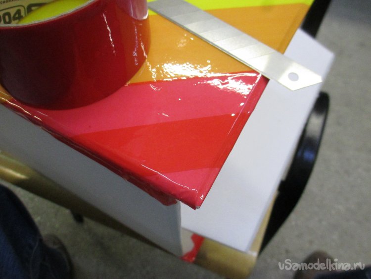 Так же аккуратно оклеиваю защитные треугольники красным скотчем.