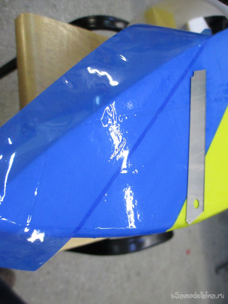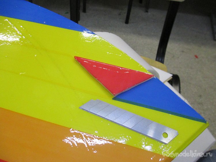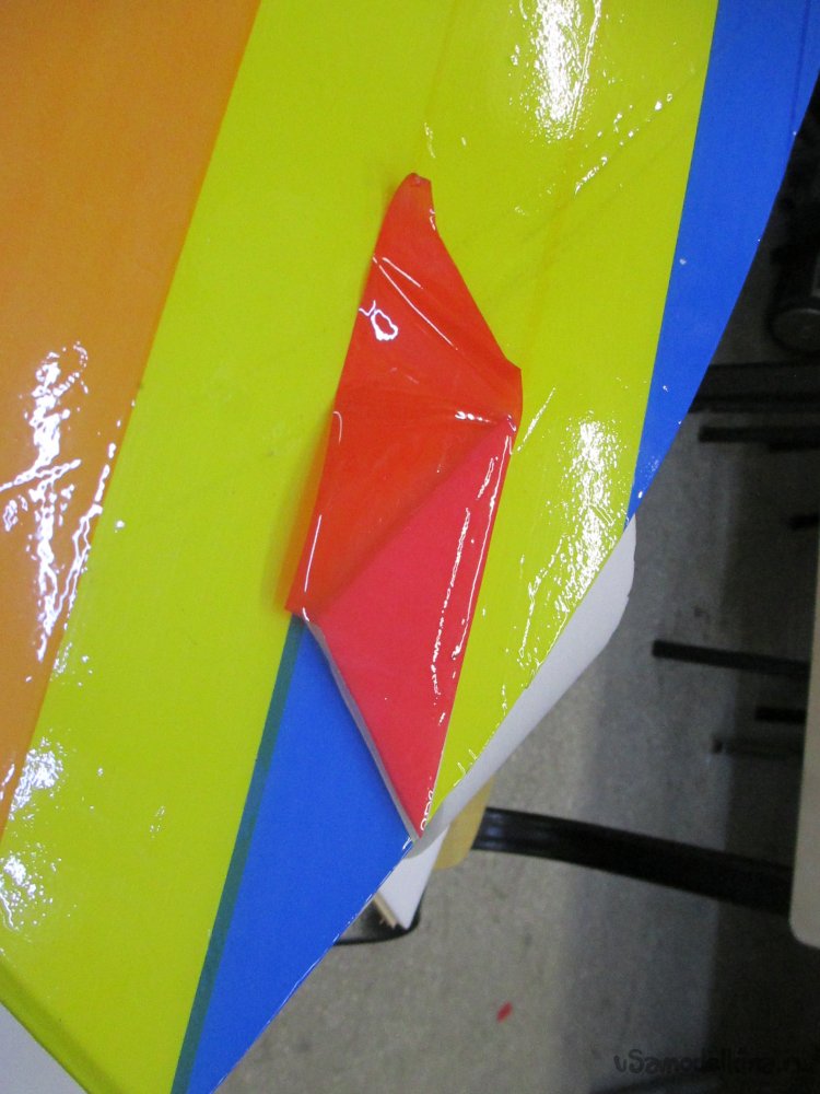 Оклеиваю руль направления вместе сто стойкой сразу. Заем просто прорезаю скотч по линии сгибания пера руля. Можно конечно оклеить до установки. Как-то пропустил этот момент.