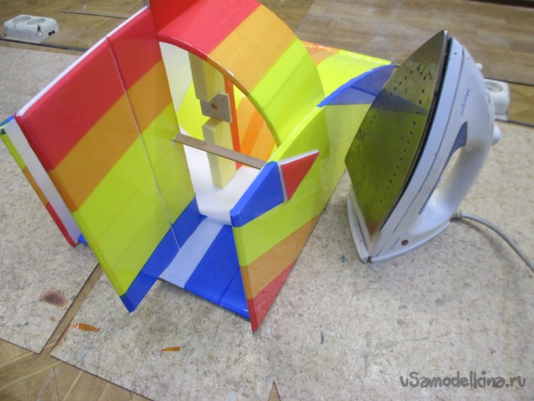 Палубу нужно изготовить из одного слоя потолочки, можно из двух, если конечно очень хочется. Перед склейкой заготовку слегка изгибаю по месту о край стола. Так она будет меньше амортизировать и топорщиться при сборке.