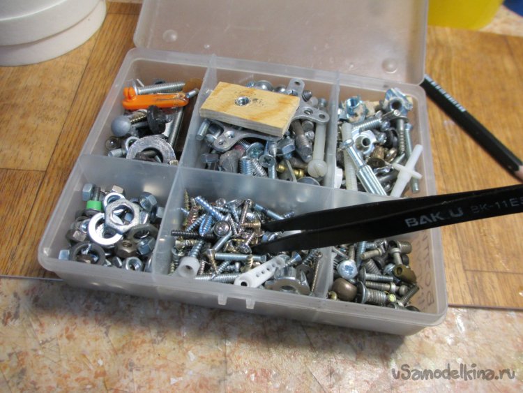 Сервопривод тестирую, при помощи сервотестера. Будет конечно не приятно, когда после установки окажется бракованным и не будет работать. Его устанавливаю на рамку, выпиленную из фруктовой фанеры и приклеенную на титан. Подбираю из коробочки винты по дереву размером 2.5х5 мм.