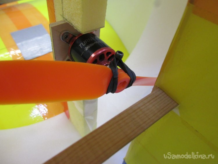 Защитное кольцо винта уже окончательно подсохло на батарее, примеряю по месту мотораму. Крепление двигателя должно быть точно по центру кольца иначе винт будет его задевать при вращении.