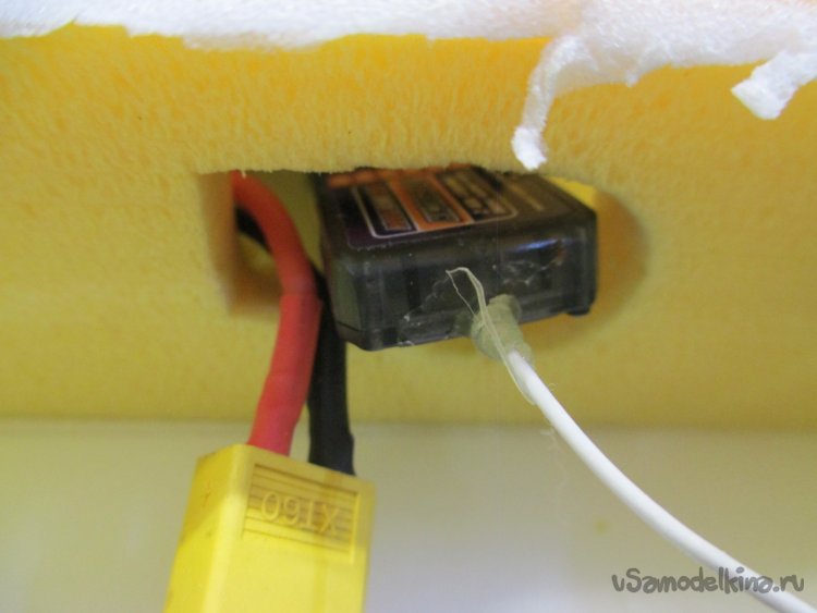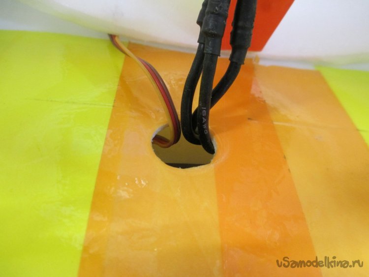 К мотору присоединяю провода удлинителя . для установки регулятора в корпус делаю отверстие в палубе. При помощи трубочки нужного диаметра. В отверстие проходят провода удлинителя от регулятора и провода управления от сервопривода. Внутри корпуса устанавливается приемник и аккумулятор.