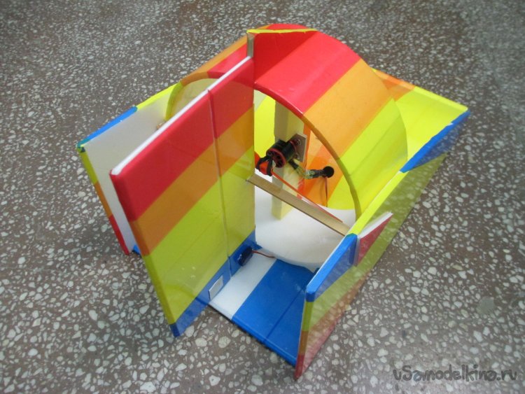 Слегка забыл, в переборке нужно прорезать отверстие для протаскивания провода от двигателя и сервопривода. Поэтому исправляю ошибку при помощи трубочки.