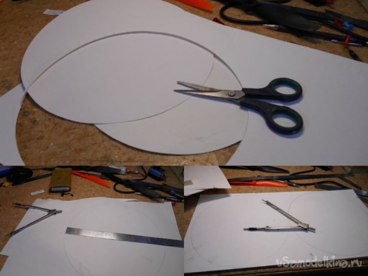 Изготовление аппарата начинаю с шаблона защиты винта. Вычерчиваю на толстом ватмане круг немого больше диаметра применяемого винта. Обычно используем винт 9х5 или 8х6. Изготовляю два шаблона.