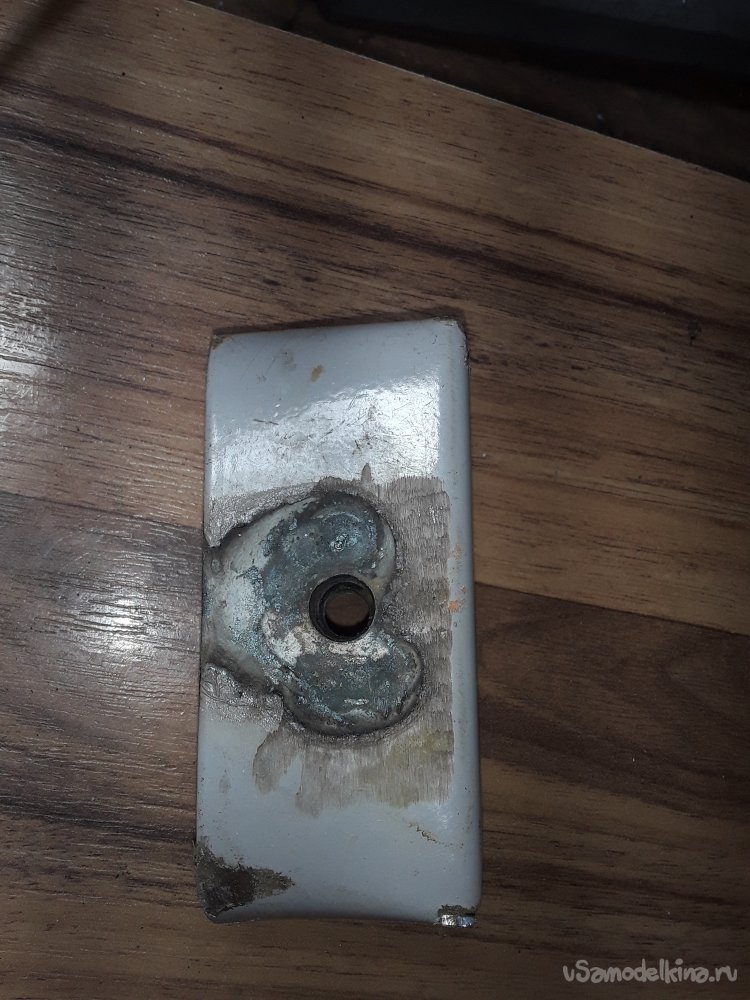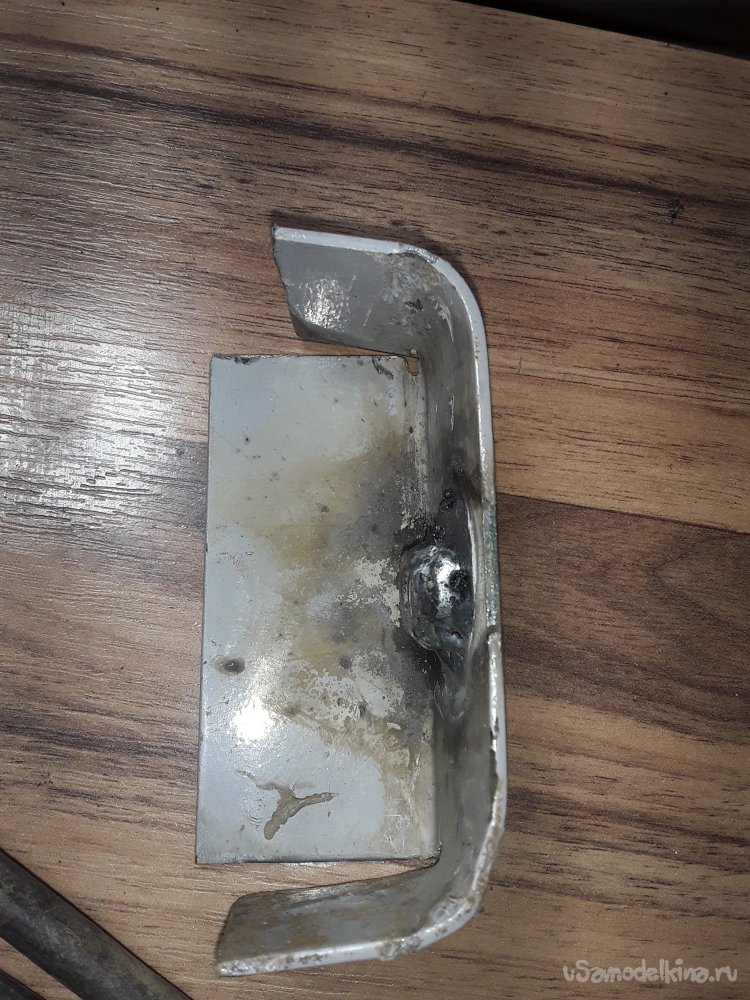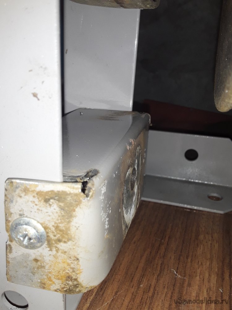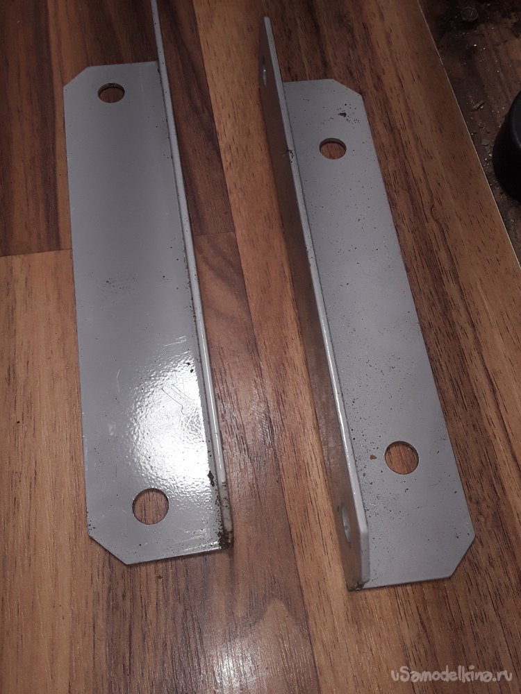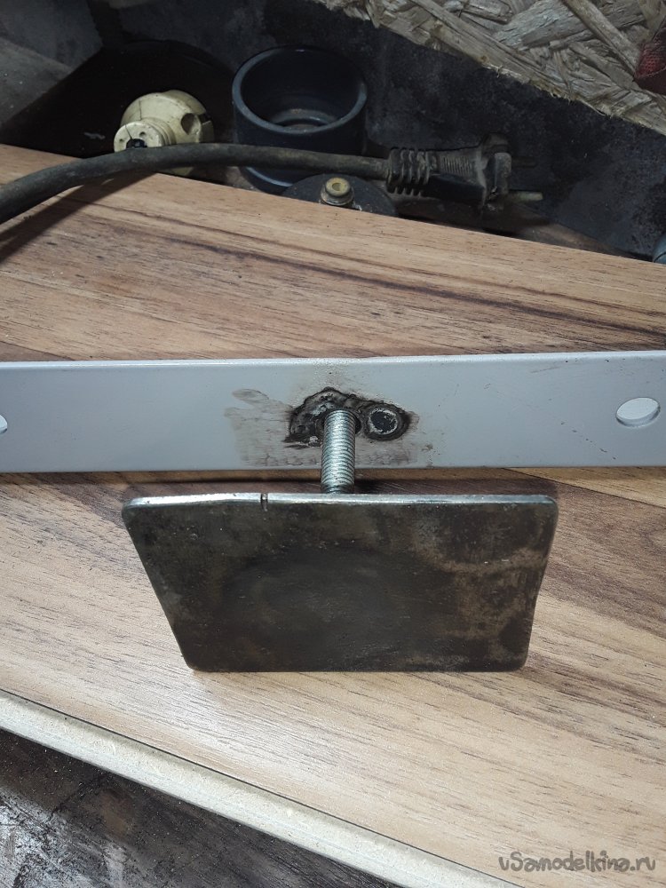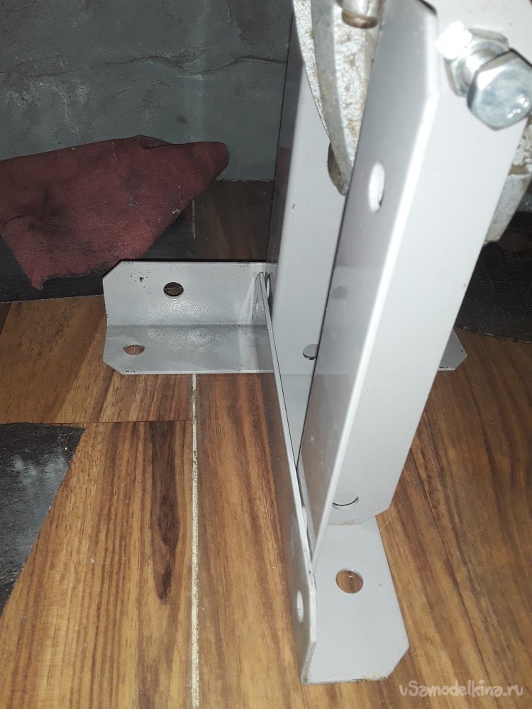 Далее для закрепления самоделки к столу взял такой же уголок выставил его, сделал разметку и просверлил в нужных местах маленькие отверстия. И закрутил саморезы с обратной стороны откусил саморезы и заклепал иначе со временем все может разболтаться. Можно было все заварить, но не стал заморачиваться да и краску жалко особо нагрузки здесь нет думаю саморезы тоже будут держать долго и прочно. Для того чтобы конструкция было устойчивой и не шаталась в бок закрепил поперек еще один уголок так же на саморезы.