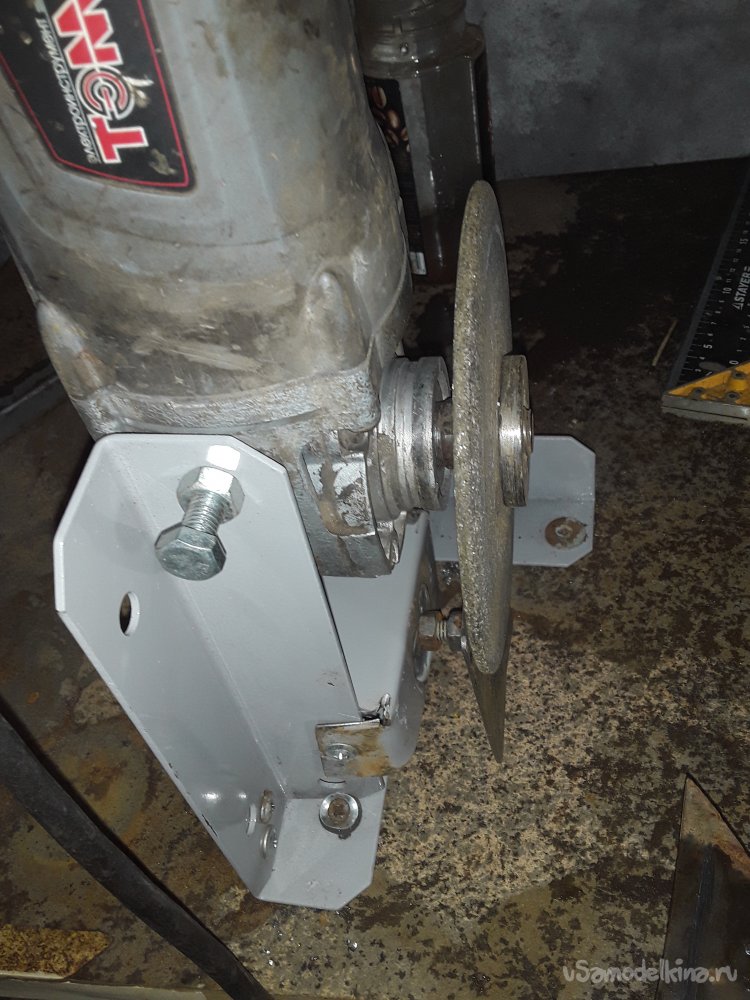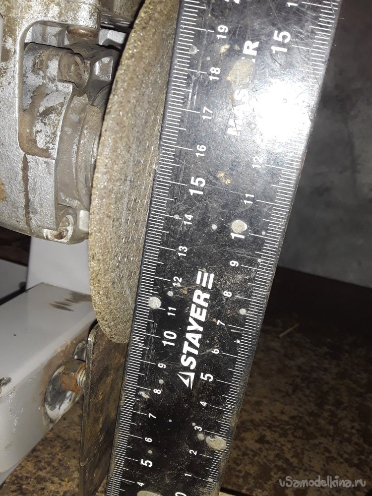 Теперь самое главное это все выставить ровно для этого я сначала выставляю крепление упора под прямой угол и фиксирую его окончательно. Потом уже ставлю диск и выставляю его относительно стола и упора под прямой угол. Самое главное это упор он должен сидеть плотно и не болтаться в резьбе и площадка должна быть ровной, а все остальное дело настроить можно. Провел первые испытания и минусом оказалось то что с боку нужно было закрепить еще уголок так как при работе болгарки станина немного шататься. Исправил все и теперь станина не шатается вообще.