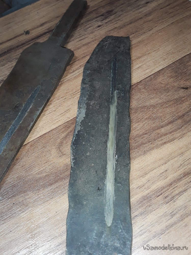 Всем здравствуйте спасибо, что обратили свое внимание на мою статью. Вчера вечером нарезал дол на клинке и немного испортил получиться криво и не симметрично. А клинок к сожалению тонкий и ничего не исправить. Клинок очень много занял время столько работы проделано впустую, но ничего страшного не учится тот кто не ошибается. Буду отковать заново, но чтобы снова не испортить клинок буду мастерить приспособление о нем то и пойдет речь в статье. В основном сейчас долы имеют эстетическое применение и по этому дол просто шлифуется на клинке. Если я отковал клинок охотнику для усиления клинка долы отковают, и клинок становиться крепче. Для нарезки черновой я делаю разметку на клинке, а потом болгаркой нарезаю отрезным диском ну а потом довожу шкуркой до конечного вида. В сети нашел самый простой вид приспособления и мало затратный решил собрать его. Поискал в запасах и нашел куски уголка 50на50 мм длинной 20 см уже окрашенные не вспомнив откуда они приступили к изготовлению.