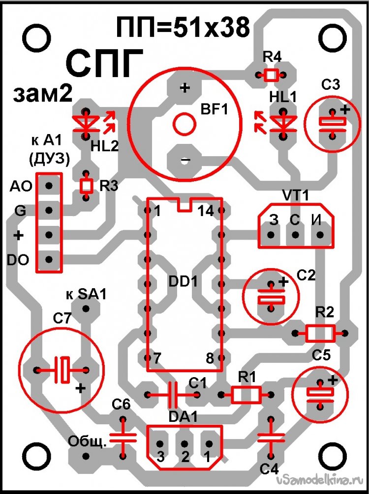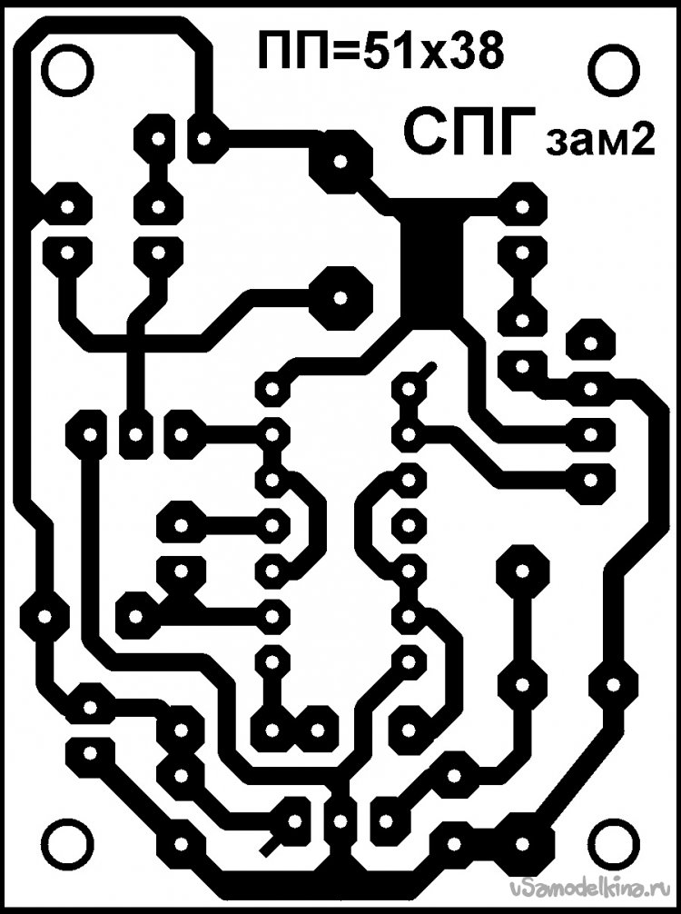 Печатная плата СПГ выполнена из односторонне фольгированного стеклотекстолита размерами 51 х 38 х 2 мм (см. рисунки 2 и 3). Диаметр отверстий на печатной плате под микросхему 0,7 … 0,8 мм, под остальные радиоэлектронные компоненты – 0,8 … 1 мм, под соединительные проводники - 1…1,2 мм, под крепёжные отверстия – 3,2 мм.