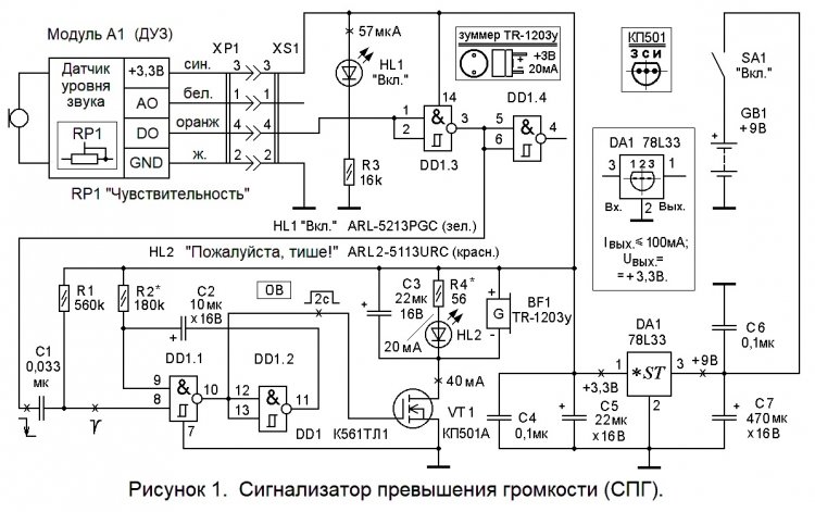 1). Сигнализатор превышения громкости – вещь интересная, но автономная. Сетевое питание не сделано, а непрерывной работы от аккумулятора в дежурном режиме хватит всего дней на 20.