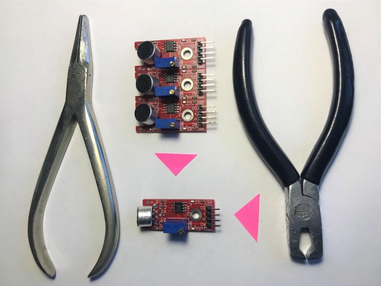 Для СПГ были заказаны готовые модули «Датчик уровня громкости», которые перед использованием следует разделить. В платах с двух сторон имеются глубокие надрезы, поэтому это не очень сложная процедура. Есть несколько вариантов разделения модулей. 1). Аккуратно отломить плоскогубцами. При этом есть риск раздавить SMD резистор или SMD светодиод, так как на плате очень мало места. 2). Проще раскусить платы неразделённых модулей клещами - гвоздодёрами. 3). Ещё проще сделать рычаг из винта М3 х 40 для разламывания плат. Винт вставляют в металлизированное отверстие на плате и закручивают гайкой М3. Торцевые кусачки нужны для уменьшения (на 2...3 мм.) длины 4 контактов штыревого разъёма.