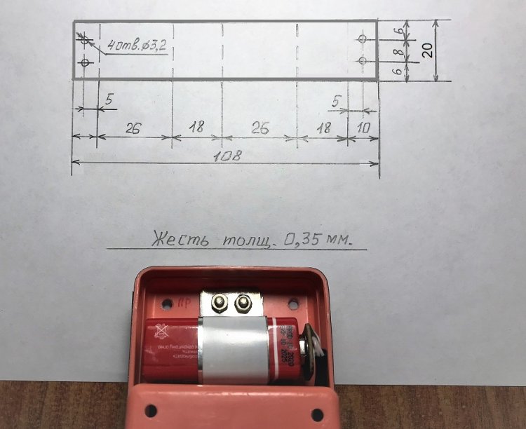 Держатель для аккумулятора GB1 изготавливается из жести толщиной 0,35 мм и с одной стороны обклеивается цветной (белой) изолентой.