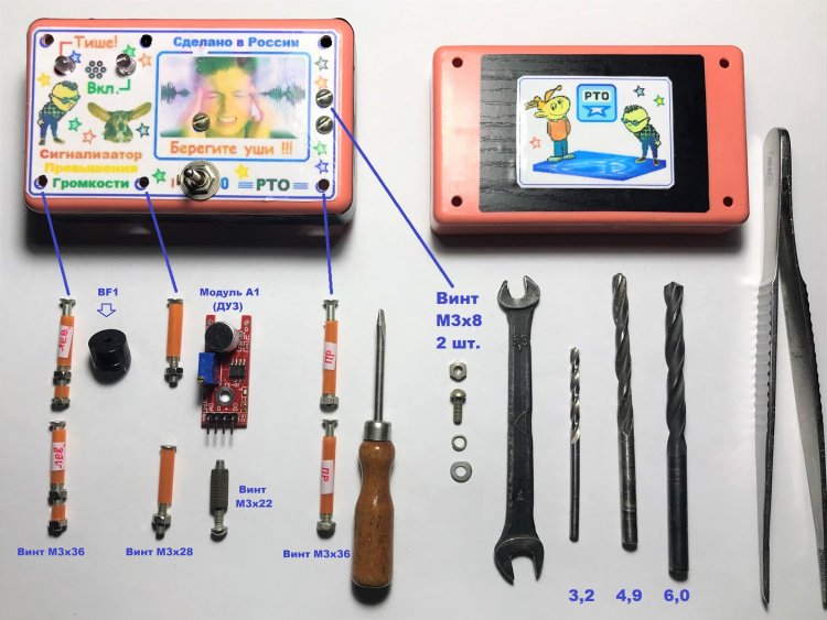 Крепёжные изделия, необходимые для крепления ПП, модуля А1, аккумулятора GB1 и скрепления обеих половинок корпуса.