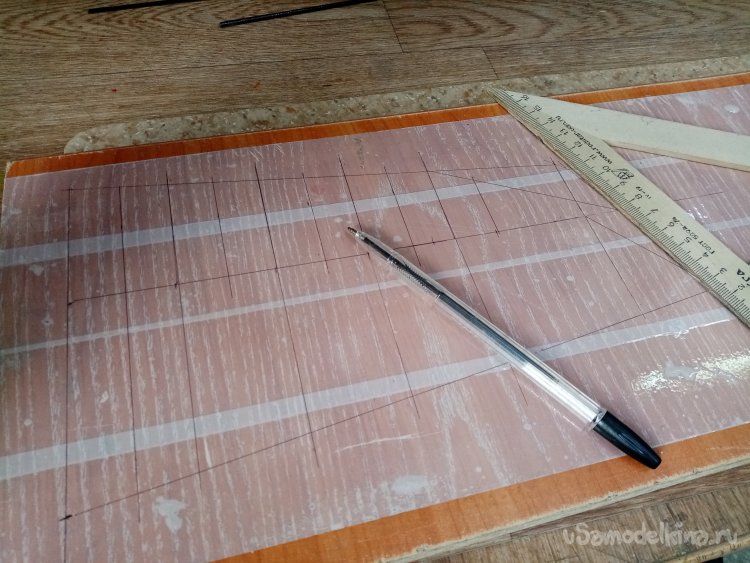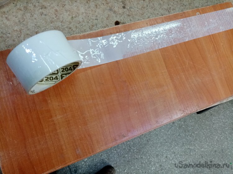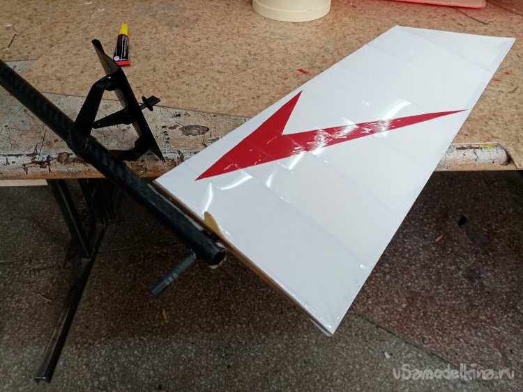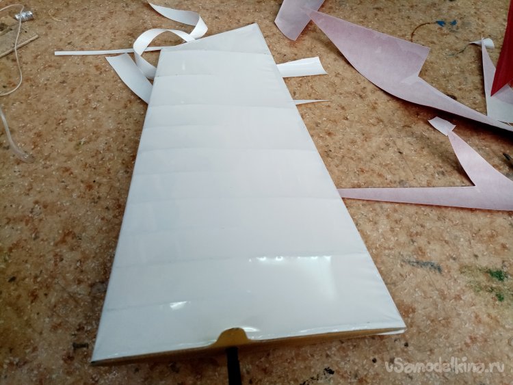 Для изготовления руля направления примерно такого же размера кА и предыдущий. Приготовил плаз из мебельной панели в 16 мм толщиной. Для защиты от клея оклеил упаковочным скотчем белого цвета, на нем лучше видно чертеж.