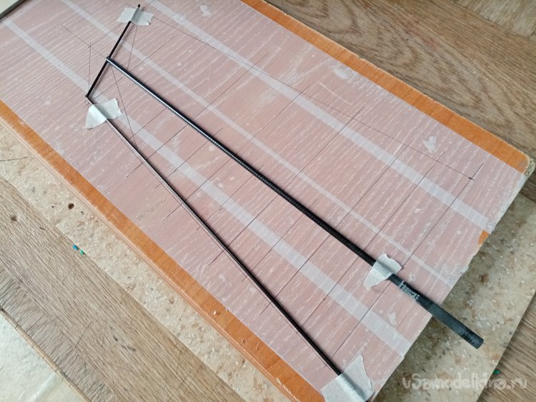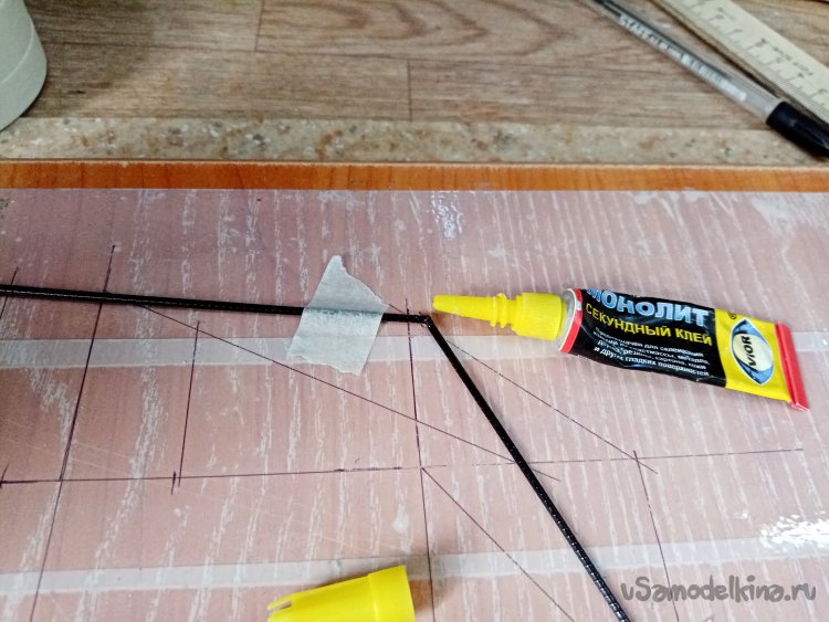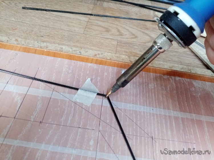 Переднюю кромку руля высоты изготовил из хлыстика от удочки диаметром в корне в 34 мм. Его закрепляю на чертеже малярным скотчем. Сгибаю при помощи шала паяльника с температурой в 190 градусов. Место изгиба проливаю циакрином для прочности.