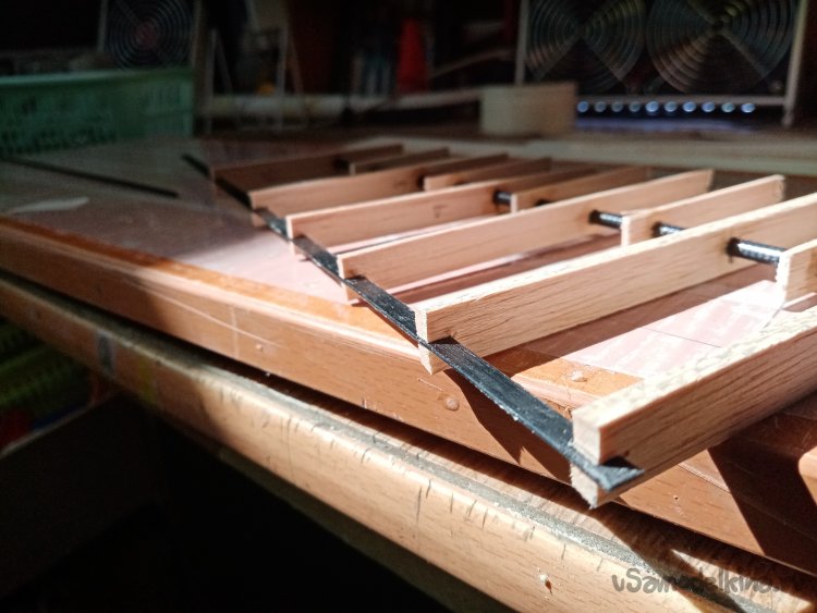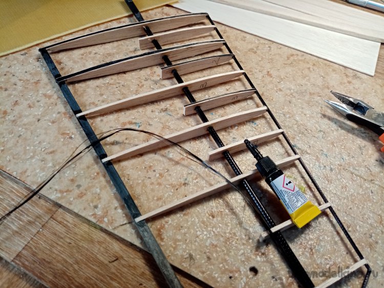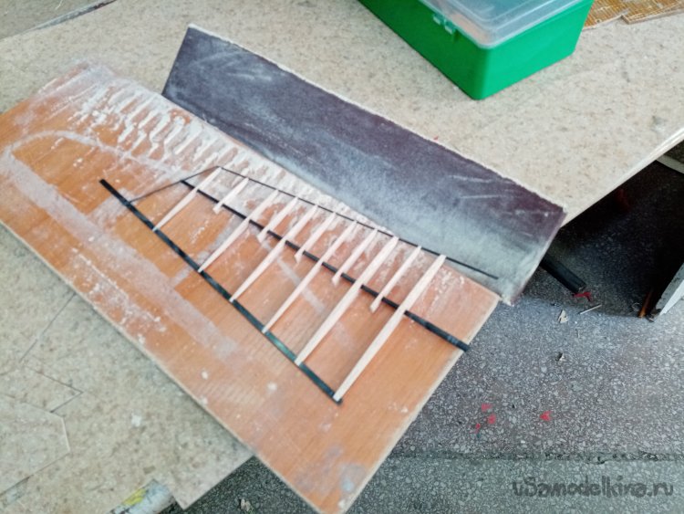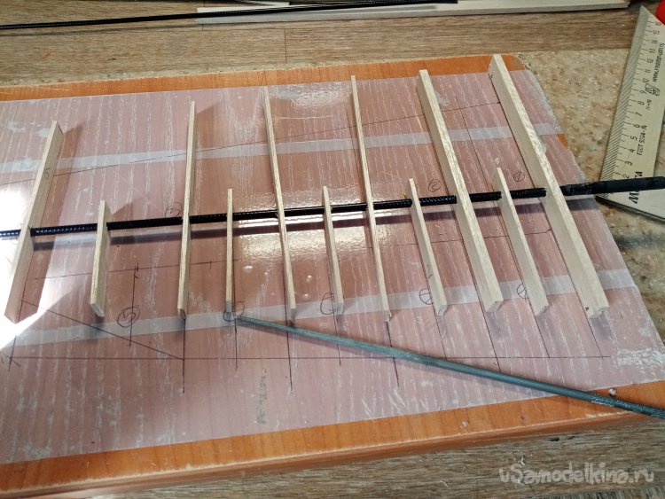 Согласно чертежу нарезал планок из бальзы по размеру будущих нервюр и полунервюр. По размеченным точкам просверлил минимальные отверстия в заготовках. Дорабатывая их круглым надфилем, установил на средний лонжерон. Обрезал длину нервюр по задней кромке. Нужно врезать заднюю кромку из угольной планки размером 1х5 мм.