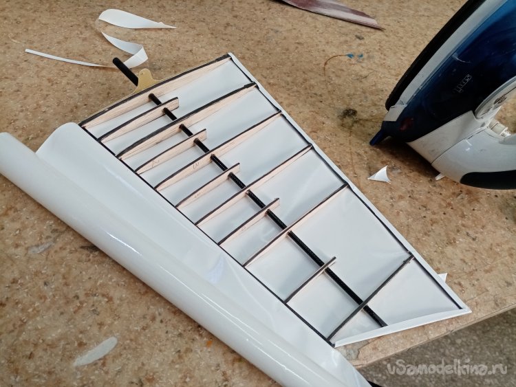 Профиль руля направления не представляет особой сложности. Он симметричен с убыванием размеров к верхней точке. Поэтому не буду вырезать профильные нервюры. Просто обработаю утюжком со шкуркой в требуемый размер.