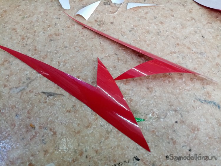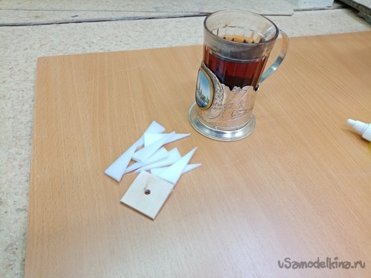 Подрезаю переднюю кромку нервюр по размеру, при помощи круглого напильника делаю прорезь под прутик. Окончательно склеиваю руль направления. При помощи утюжка со шкуркой нужного номера начинаю осторожно придавать симметричный профиль нервюрам с сужением к верхней части. После получаса осторожного «пилинга и шкуринга» получается вполне симпатичный руль направления.