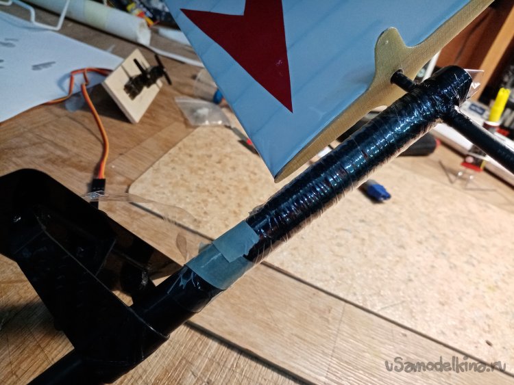Боудены протягиваю внутри хвостовой балки и закрепляю пробками из жесткого упаковочного поролона.