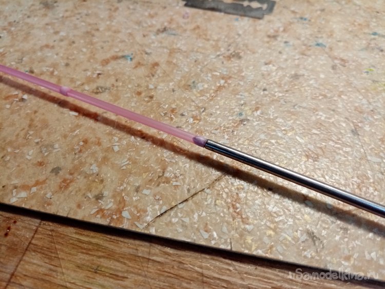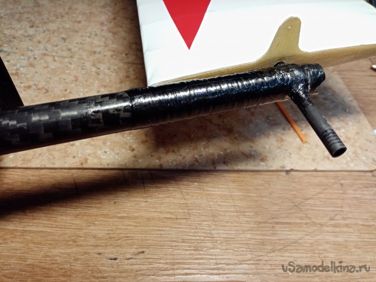 Центральный лонжерон тоже делаю из хлыстика удочки, только большего диаметра в комле в 6 мм. Для качественного сопряжения карбоновых трубочек на кончике центрального лонжерона пропиливаю углубление при помощи круглого надфиля.