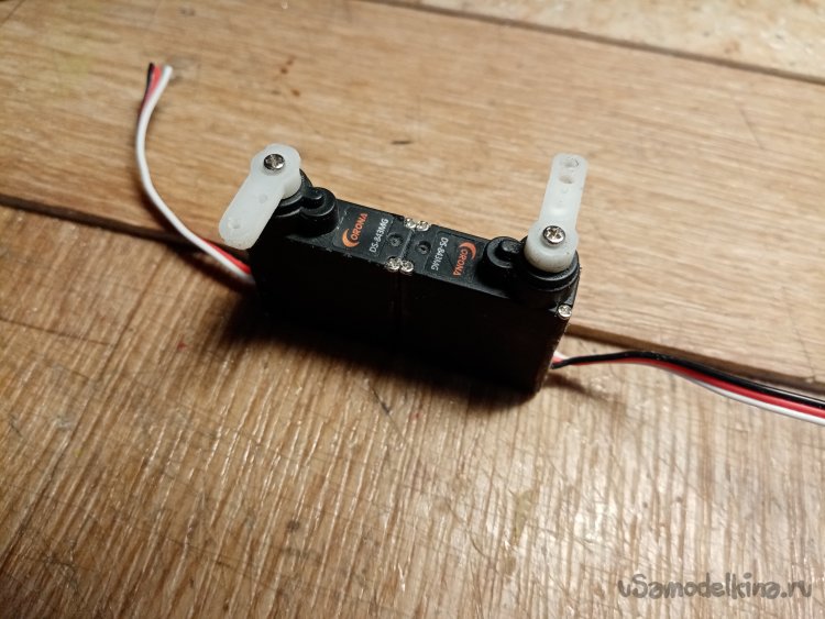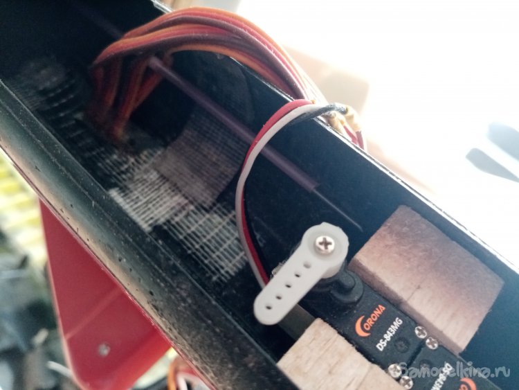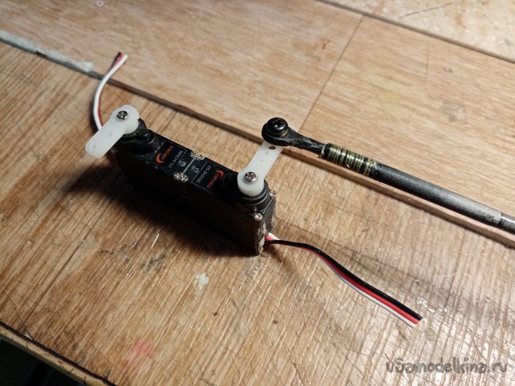 Маленьким болтиком закрепляю наконечники на качалку сервопривода. Получилось неплохо, все вращается без заклинивания и легко.