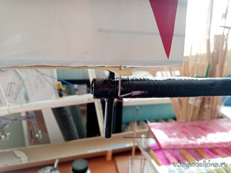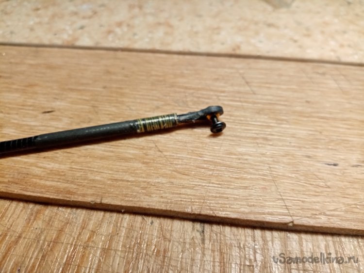 Просверливаю отверстие на конце хвостика под установку трубки крепления руля направления. В нее будет вставляться центральный прутик. При такой конструкции получаю цельно поворотный руль направления. Но есть небольшая проблема. На самом кончике хвостовой балки есть небольшие трещины и отверстия крепления предыдущего руля. Нужно укрепить детальку. Поэтому обматываю