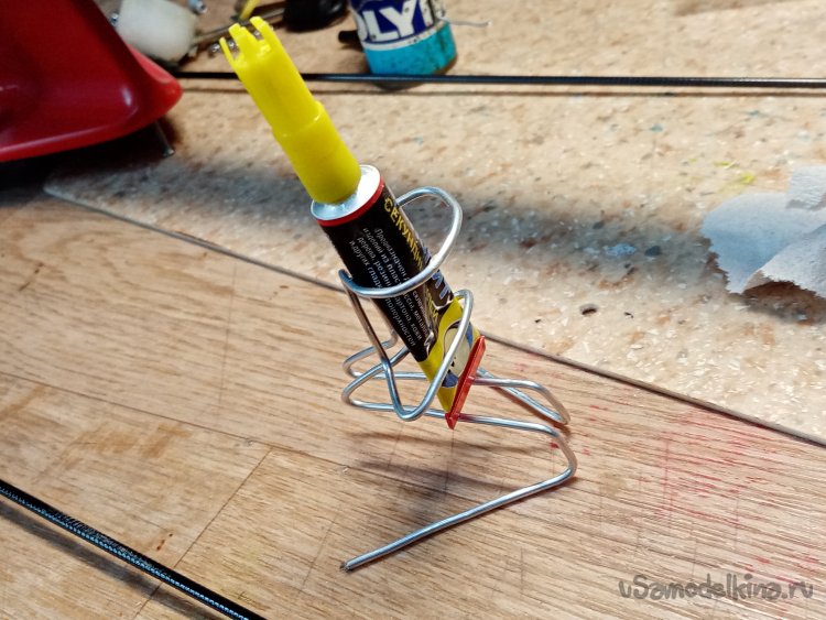 Мимоходом изготовил из алюминиевой проволоки такую подставку для тюбика циакринового клея.