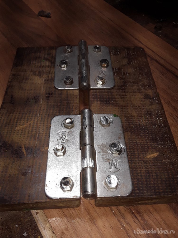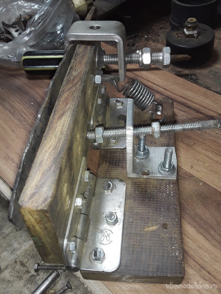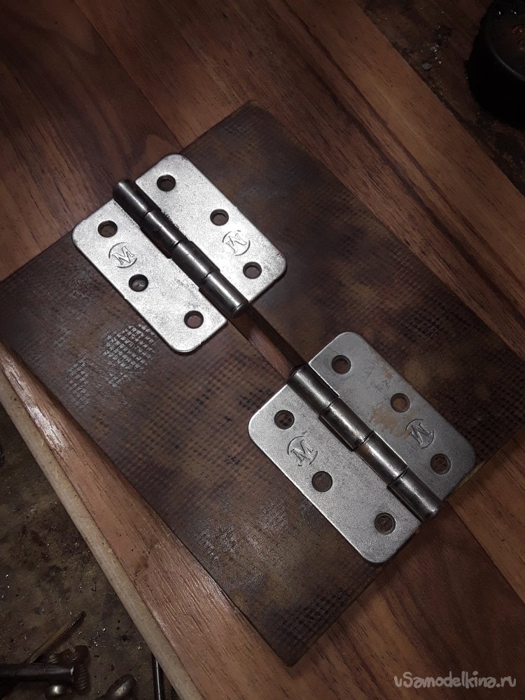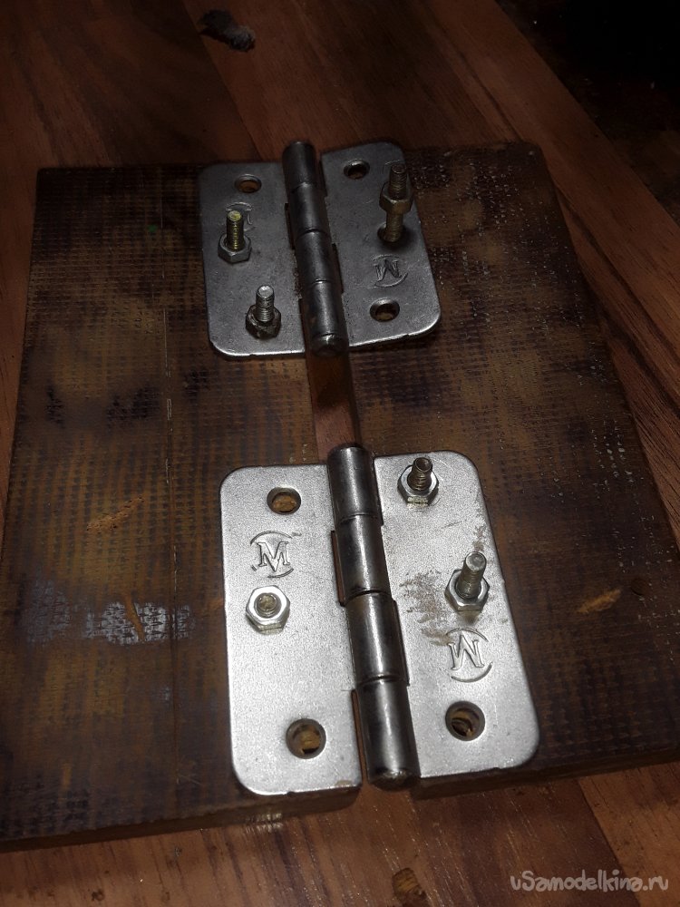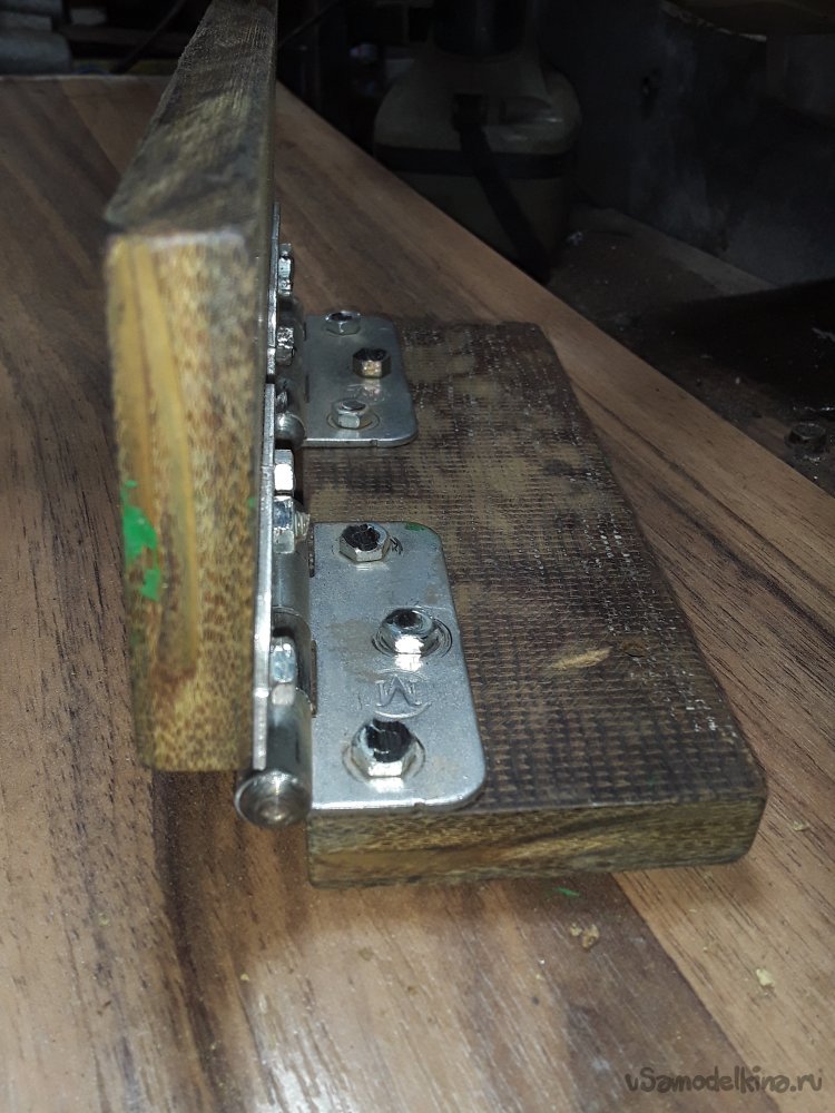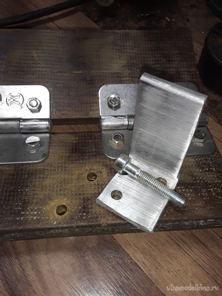 Из листа текстолита вырезаю 2 куска 7см на 15см режу болгаркой простым отрезным диском при резке обязательно нужно надеть респиратор и очки. Так как этот материал вредный тем более когда пилишь сильно летит пыль. Отрезав нужные куски выставляю все ровно под углом и положив сверху два навеса делаю разметку.Навесы брать лучше много петлевые из толстого металла иначе сделать прочное регулирование угла не получится. Ведь при малейшем смещении угол одной из сторон будет не ровным. Перед установкой немного подбил петли чтобы туговато работали и смазал маслом. Почему я взял два, а не один большой потому что на одном навесе все равно будет люфт а, когда остановлено 2 то конструкция будет гораздо прочнее.Для крепления навесов и всего что крепится обратиться к большой жестяной банки времен ссср. В банке находятся драгоценности, а это разной длинны болты и гайки всякие шайбы и железки это все мне досталось от деда, а ему от его деда в общем из поколения в поколения так говорится наследство. С большей легкостью я нашел нужные мне детали высокого качества и количество. Я считаю что такие вещи нужно беречь так ка больше не делают как в старые добрые времена китайцы. После разметки просверливаю тонким сверлом все отверстия, а затем 2‑х мм сверлом уже под болты. Для того чтобы шляпки болтов не мешались сверлом на 8мм немного сверлю на глубину 2мм. Перед установкой шлифую на ровной поверхности все плоскость чтобы они были идеально ровные. Далее наворачиваю болты, и затягиваю гайки, а все что не нужно отрезаю болгаркой и поправляю напильником.