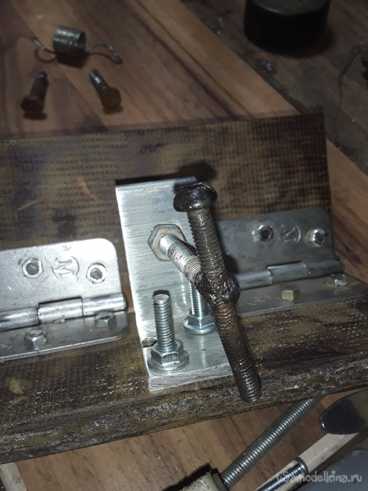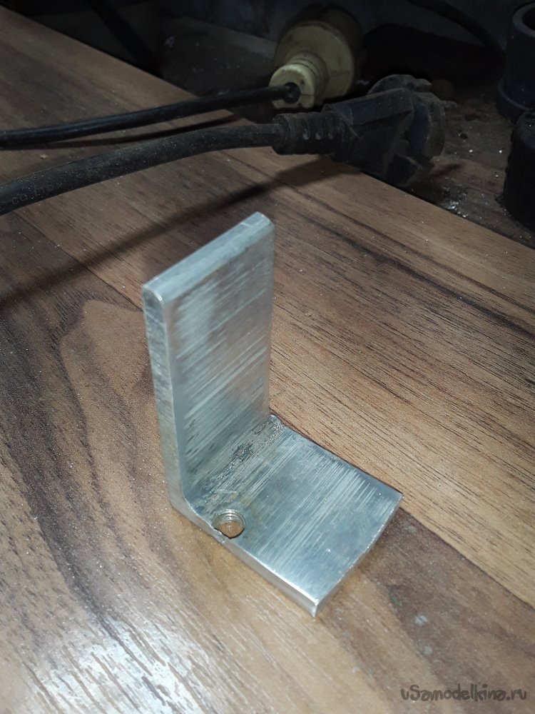 Для механизма изменения угла обработки взял кусок алюминиевого уголка 50на50 шириной 2см. Установил уголок между навесами, и сделал отверстия под болты с мелкой резьбой под шестигранник. Для того чтобы утопить головку болта немного большим сверлом и установив все на место затянул гайками. Отступил от края 1см и просверлил 2мм сверлом, а потом нарезал резьбу. От куска шпильки 3мм отрезаю кусок длинной 13см и накрутив по сторонам две гайки. Для удобства привариваю на конец маленький болтик ну и устанавливаю все на свое место все же без контр гайки как то опасно алюминий очень мягкий по этому буду контрить на всякий случай.
